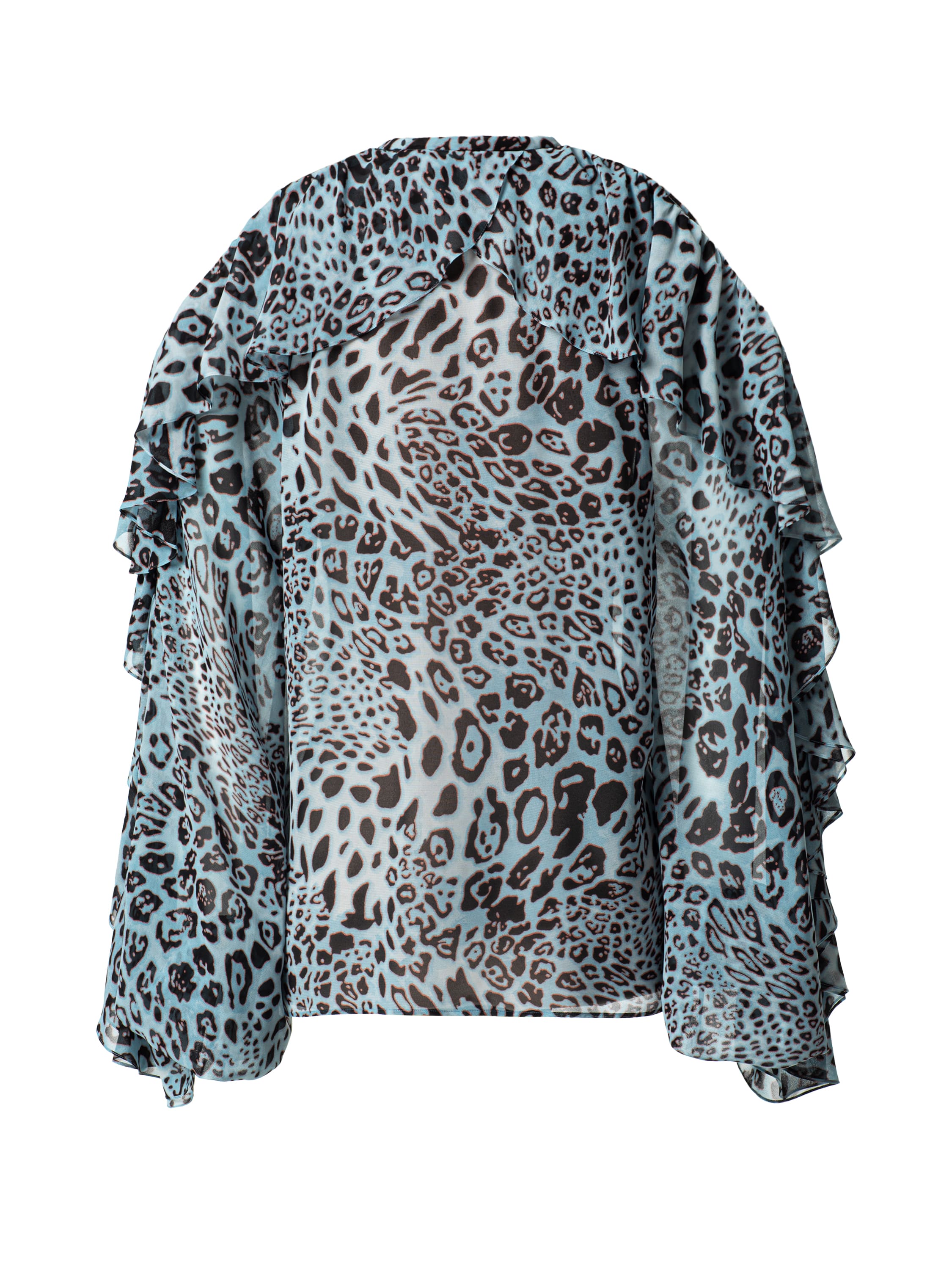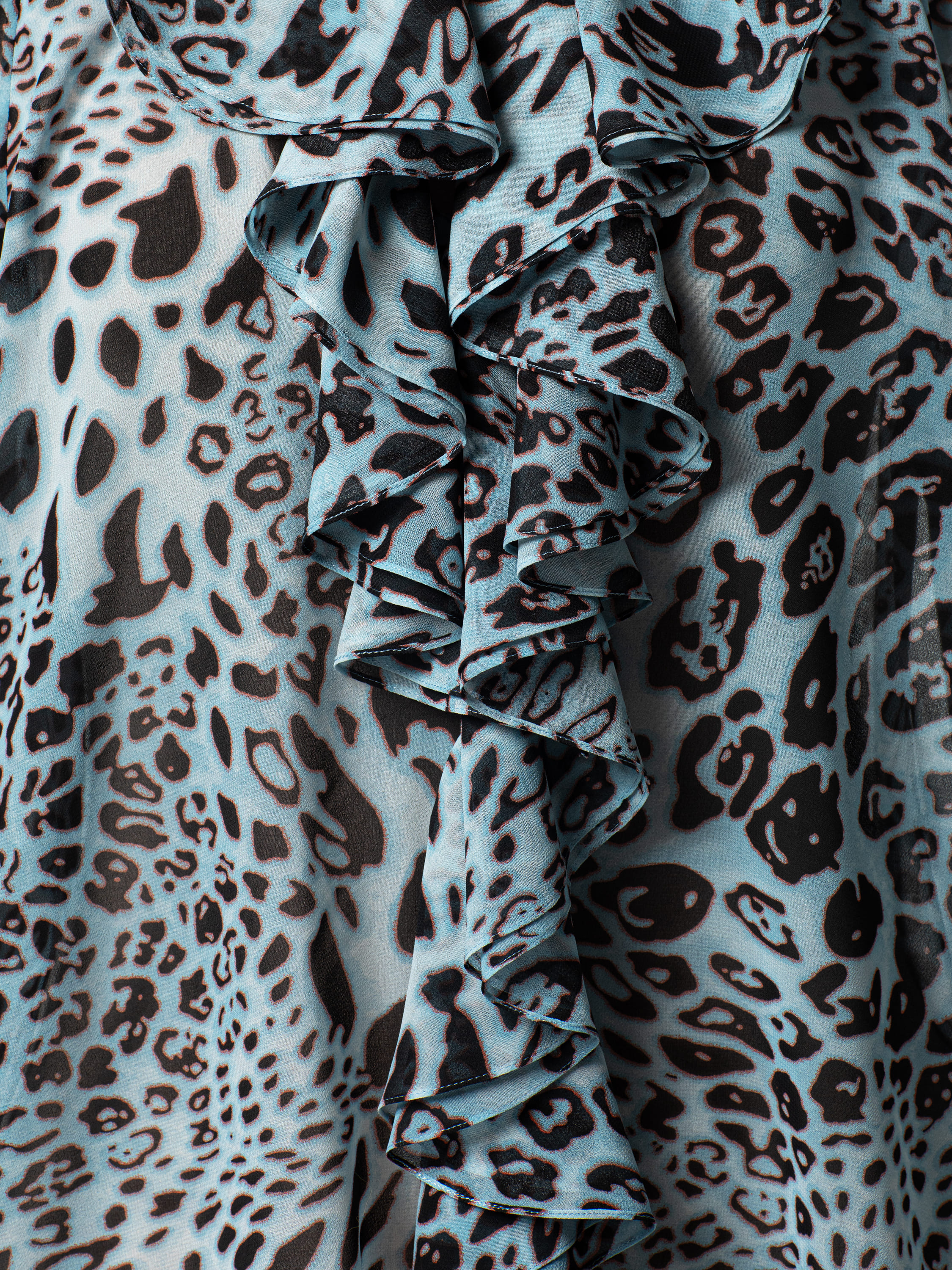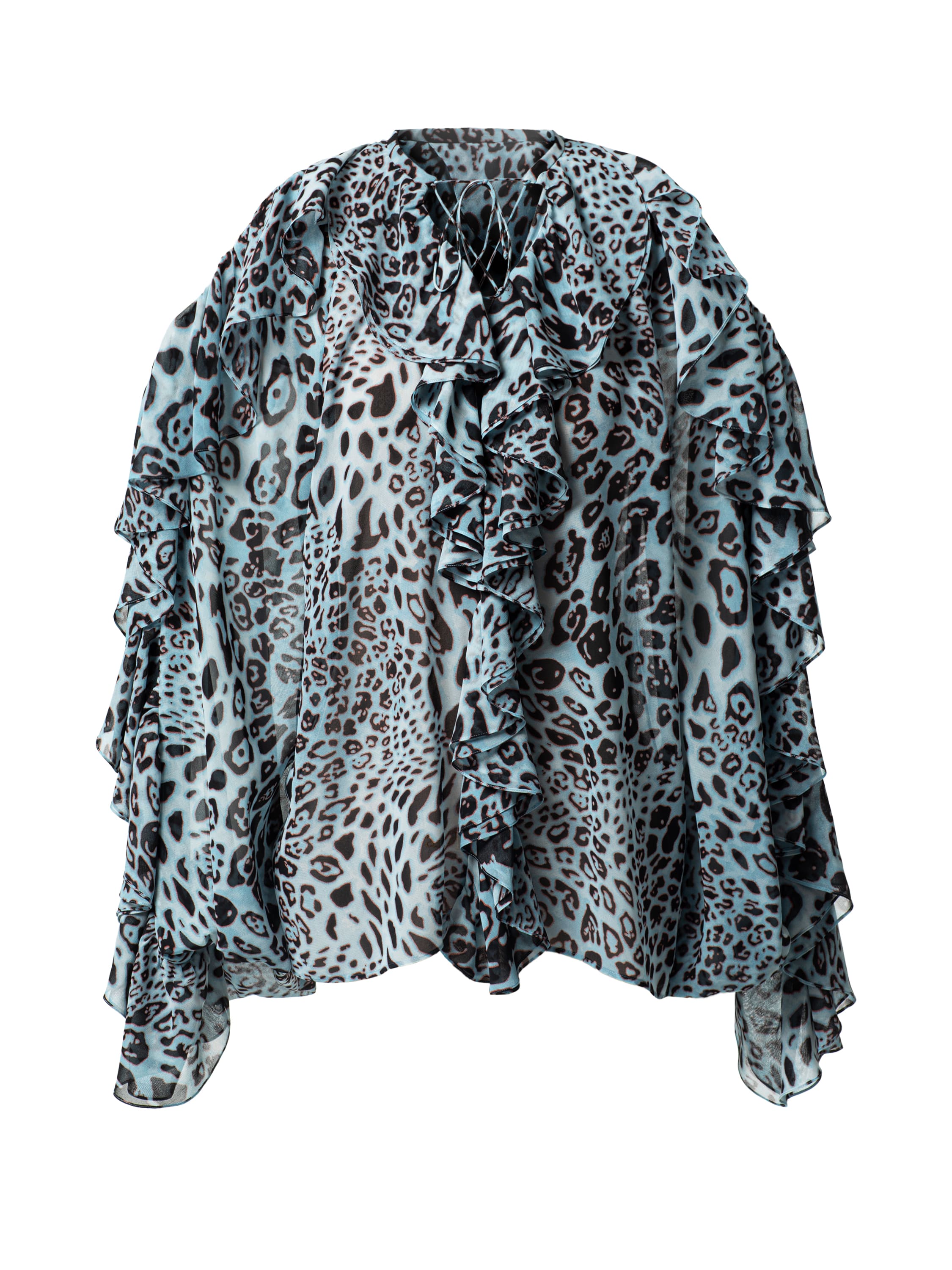 Голубая блузка из шифона с леопардовым принтом станет ярким элементом образа. Модель с романтичными воланами дополнена завязками спереди.