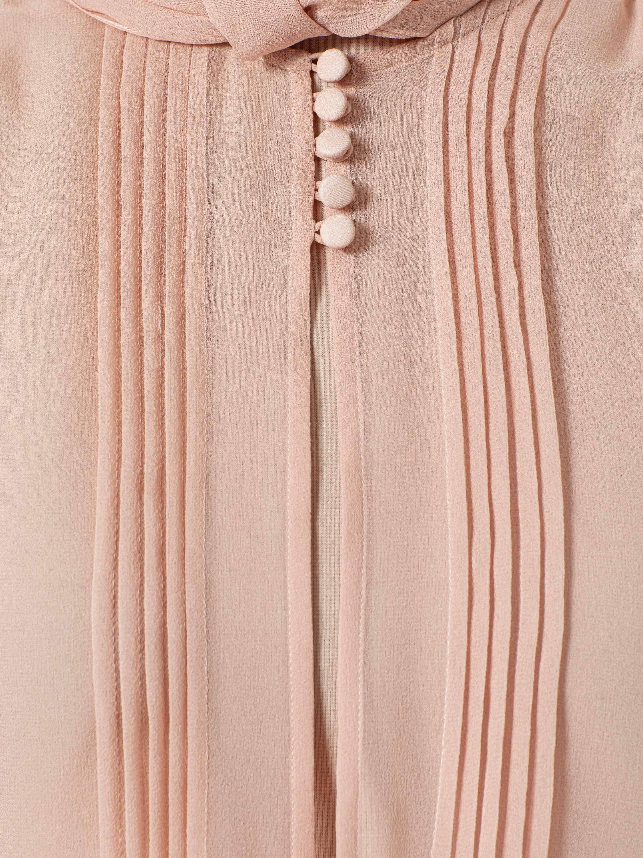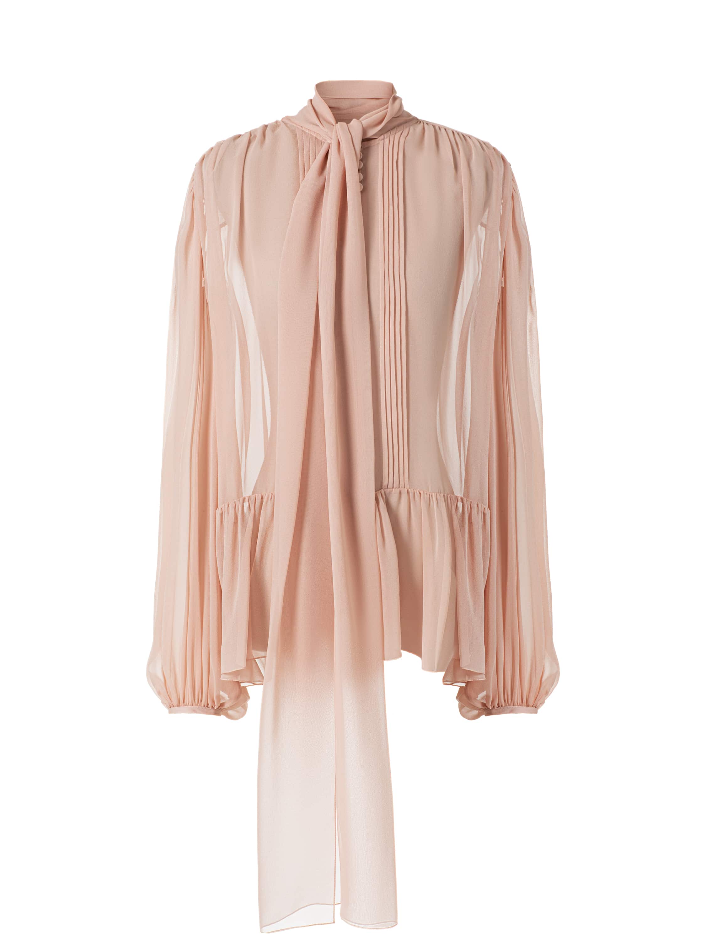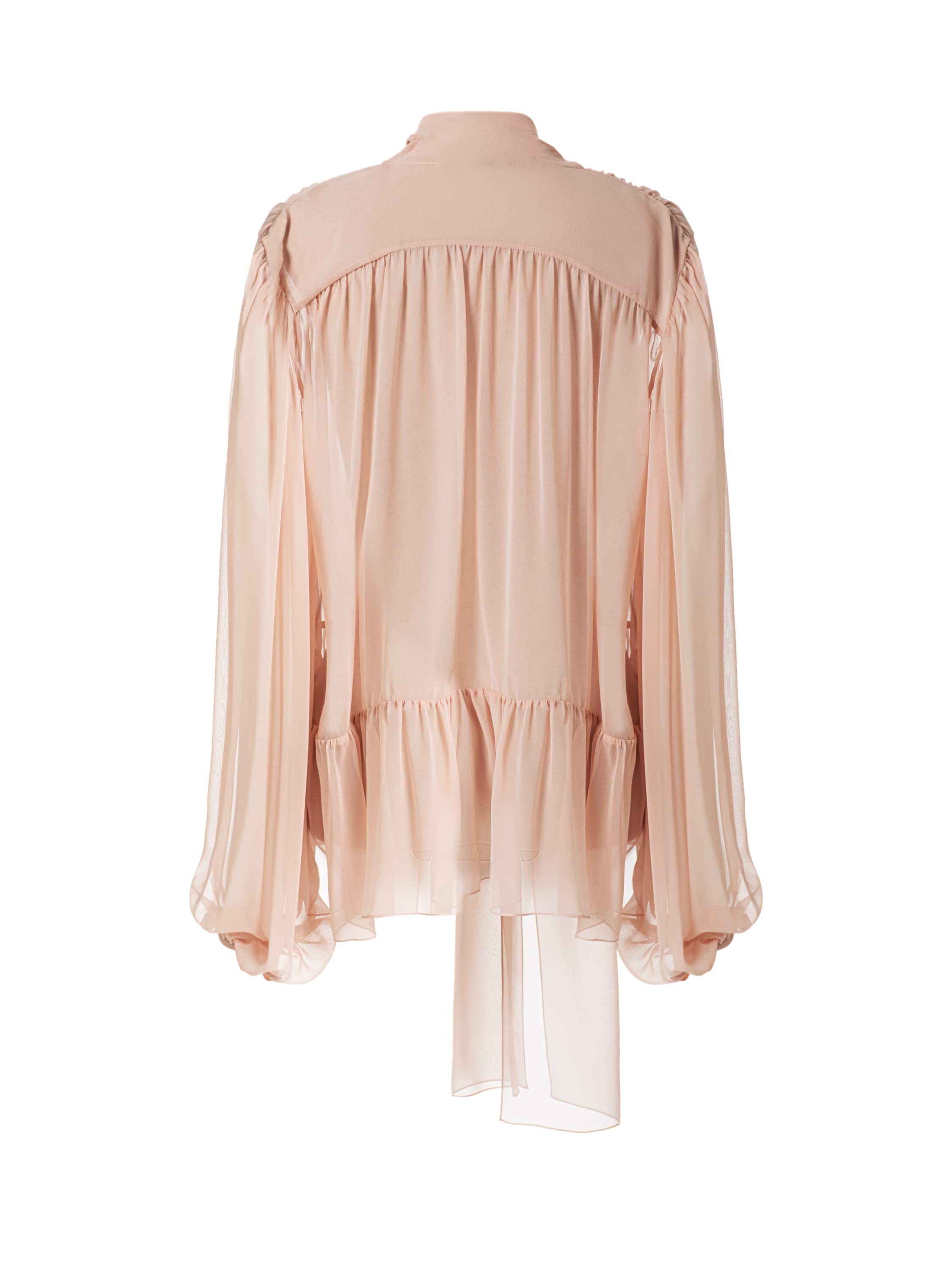 Блузка с рукавами-фонариками выполнена из легкого шелка светло-розового цвета. Длинный воротник-аскот завязывается в элегантный бант. Модель дополнена воланом снизу.