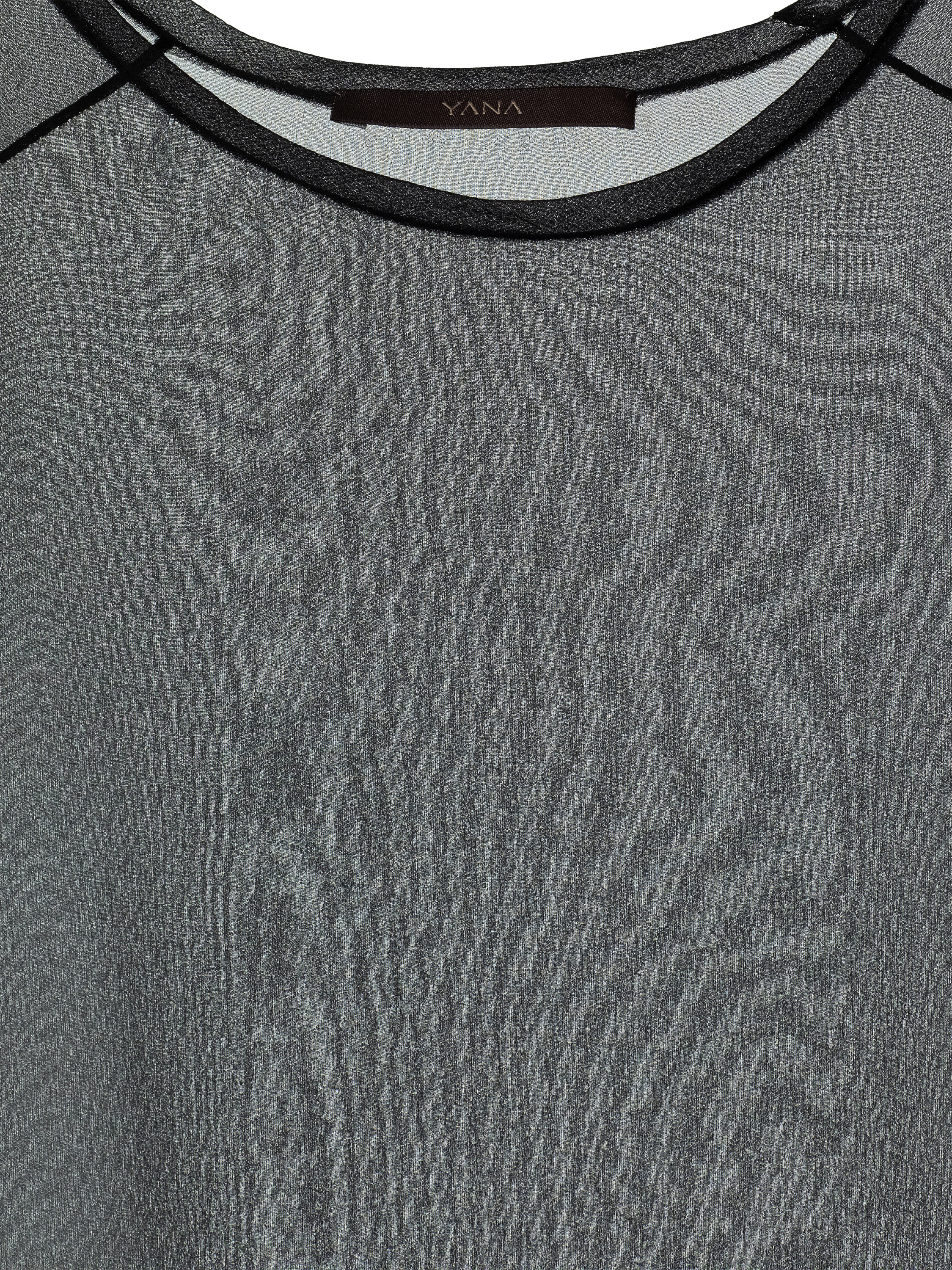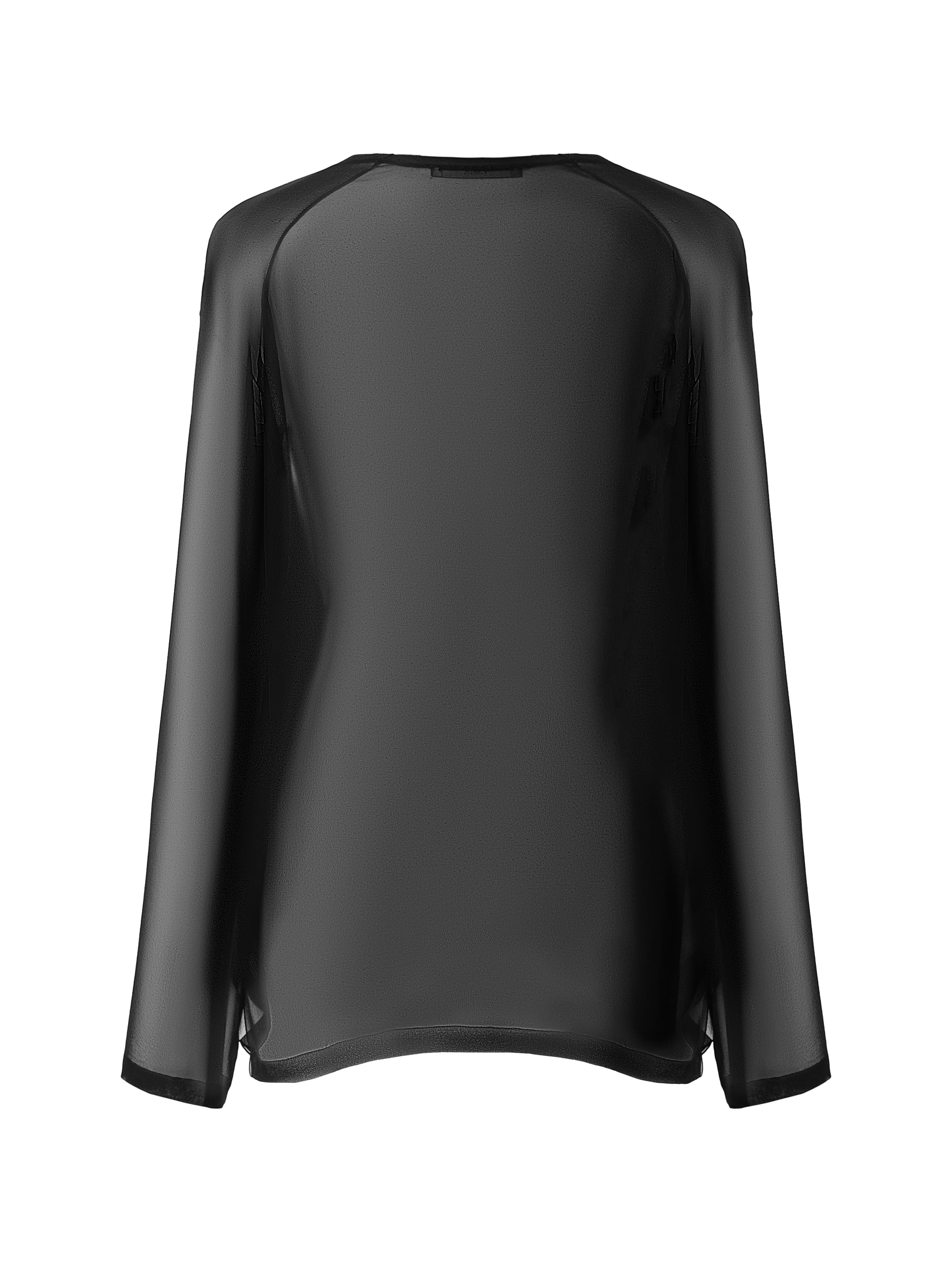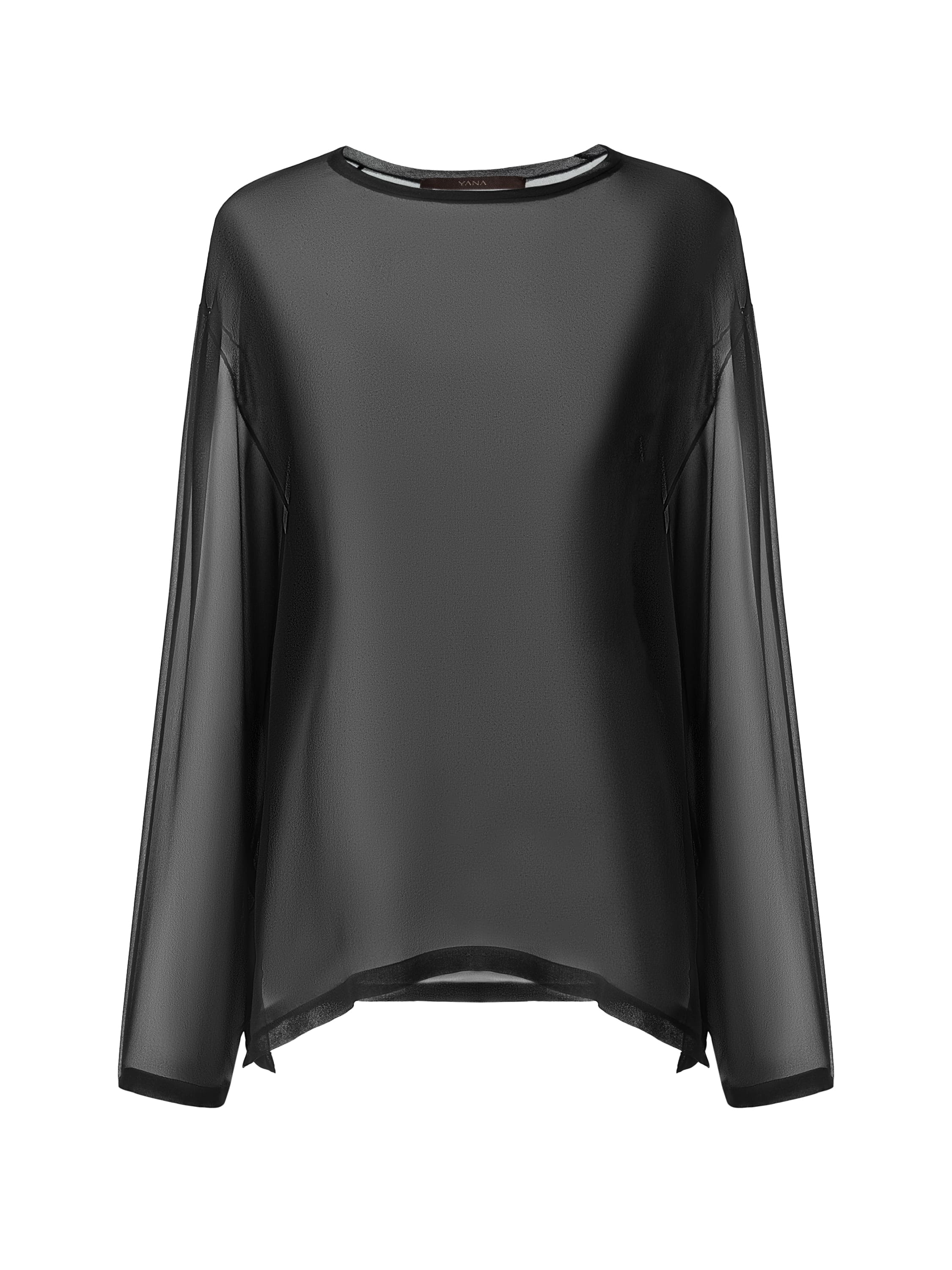 Полупрозрачный черный лонгслив выполнен из черного шелкового шифона. Модель с круглым вырезом дополнена спущенной линией плеч.