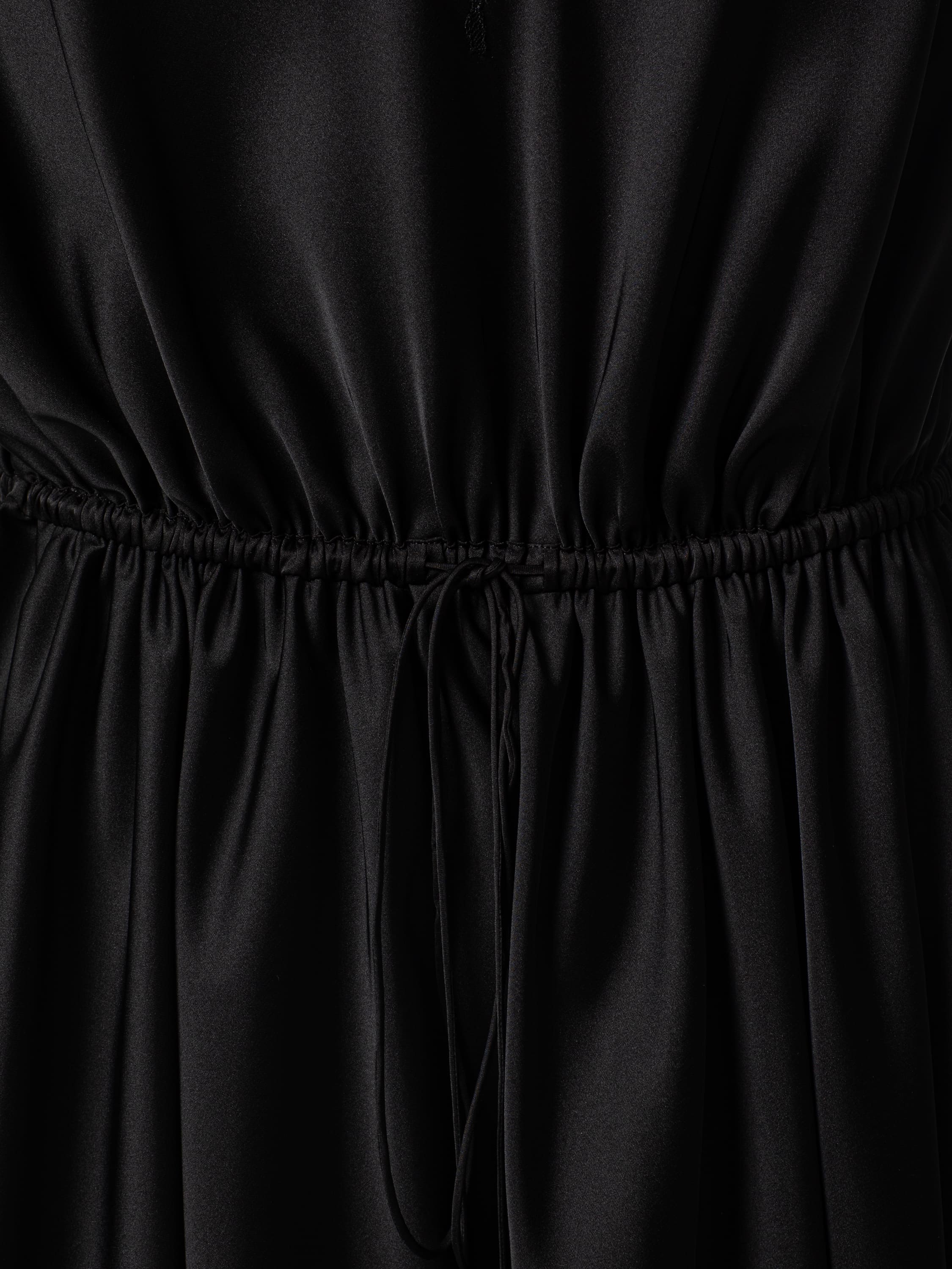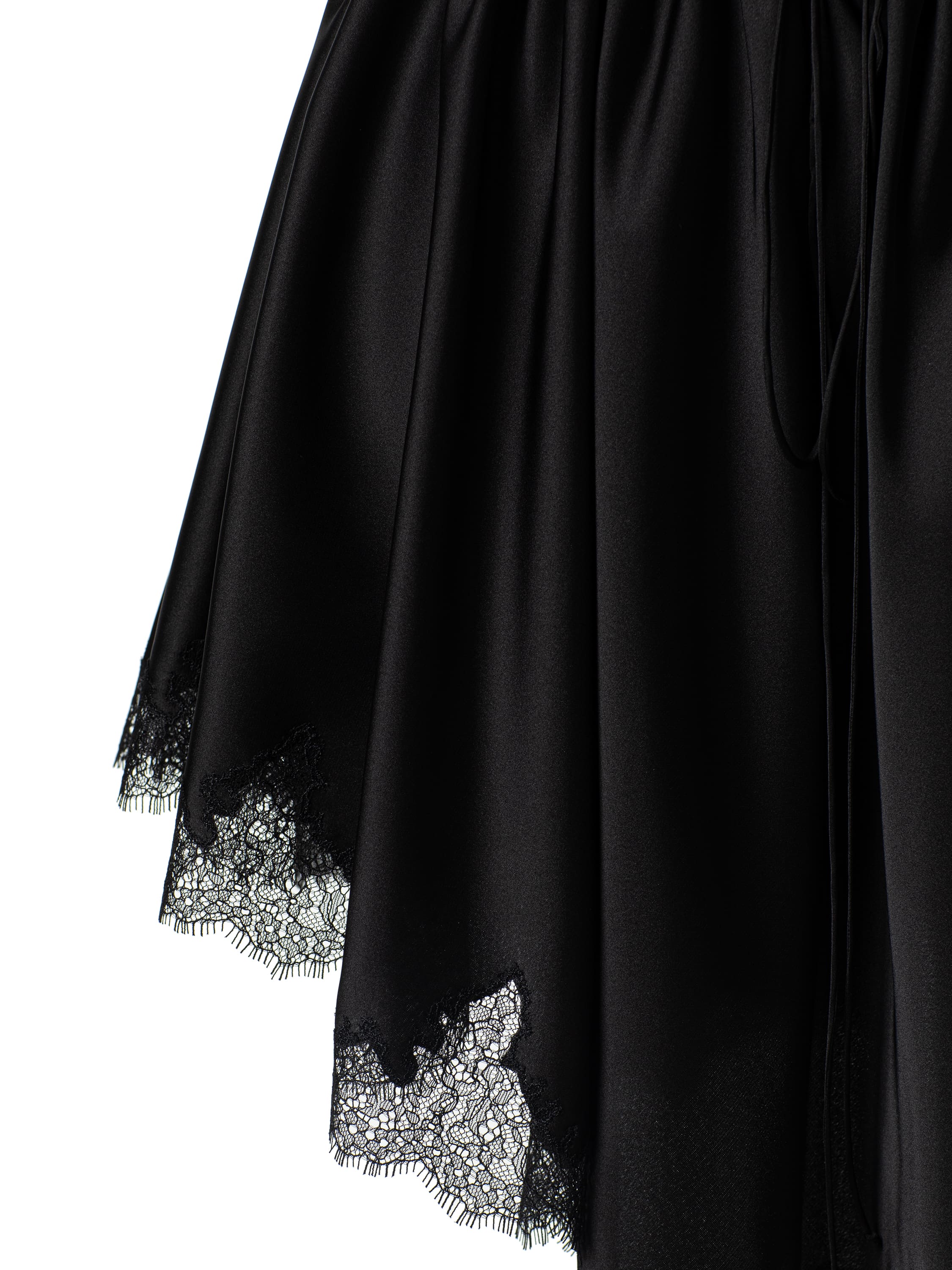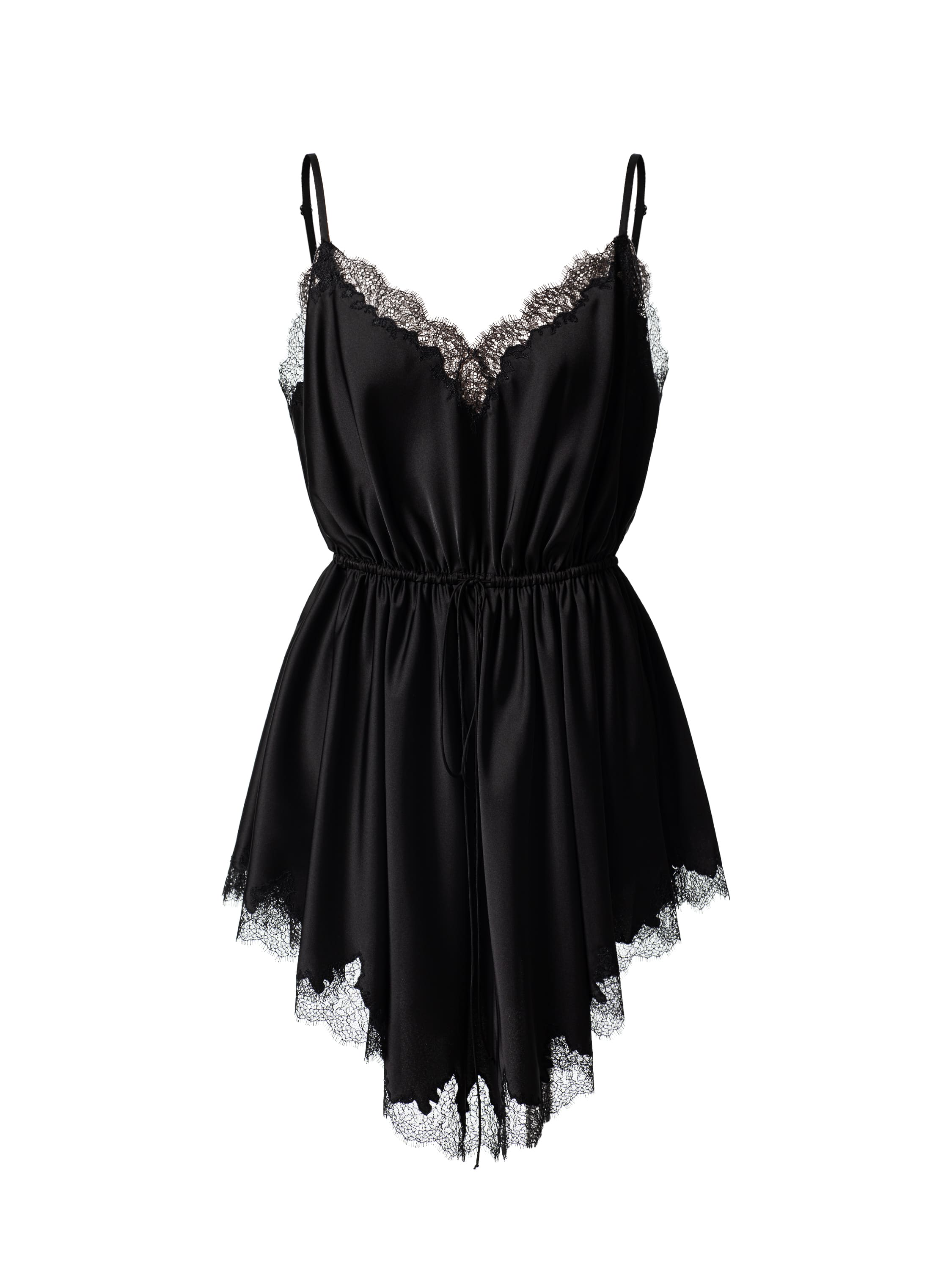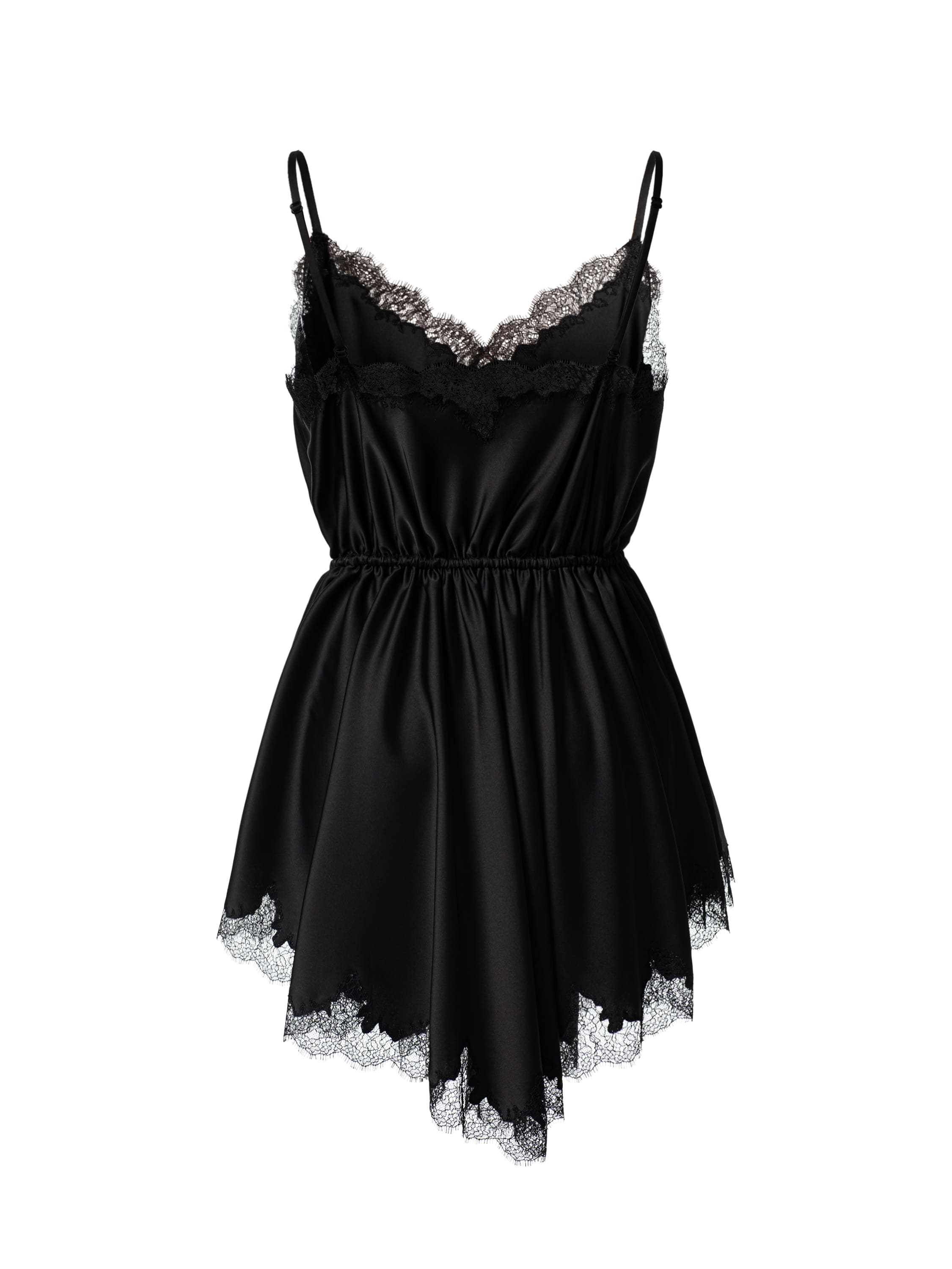 Черное платье-комбинация из атласа может стать основой как для повседневного, так и для вечернего образа. Модель с асимметричной юбкой-мини украсили элегантным кружевом. Бретели дополнены регуляторами. Линия талии подчеркнута кулиской. На декор изделия кружевом мастерам Модного дома YANA потребовалось 16 часов ручной работы.
