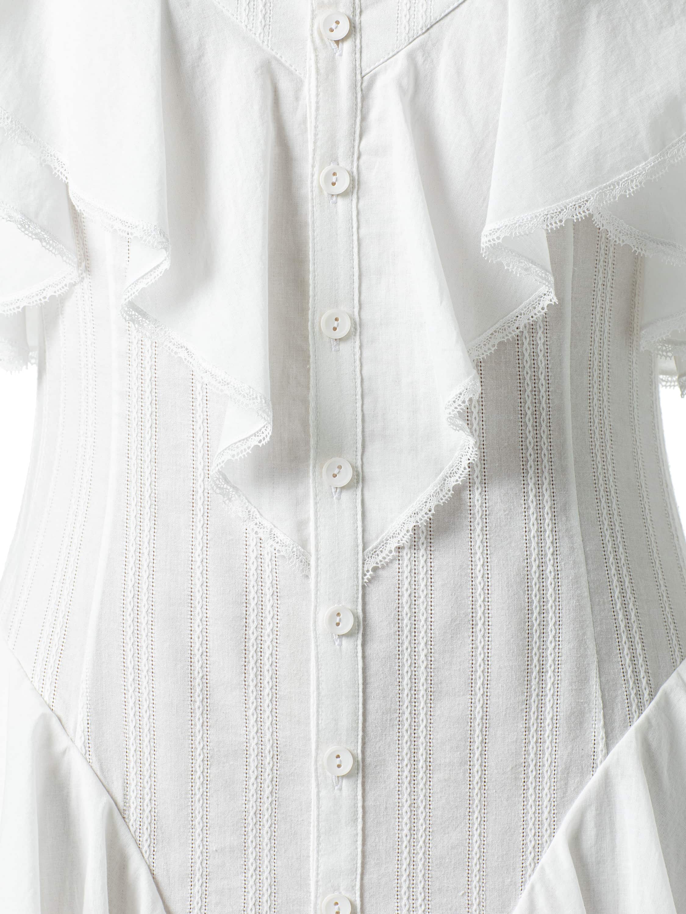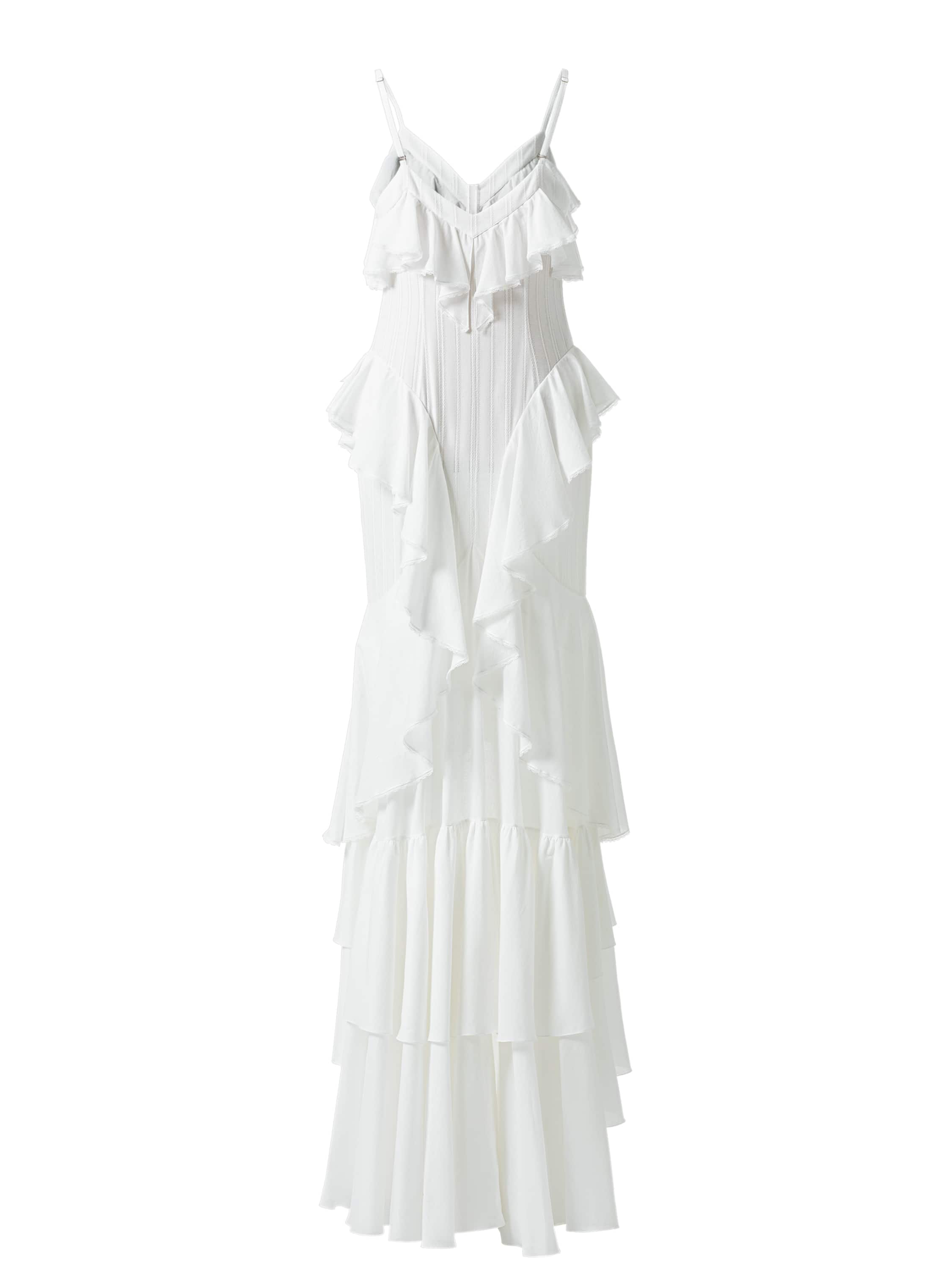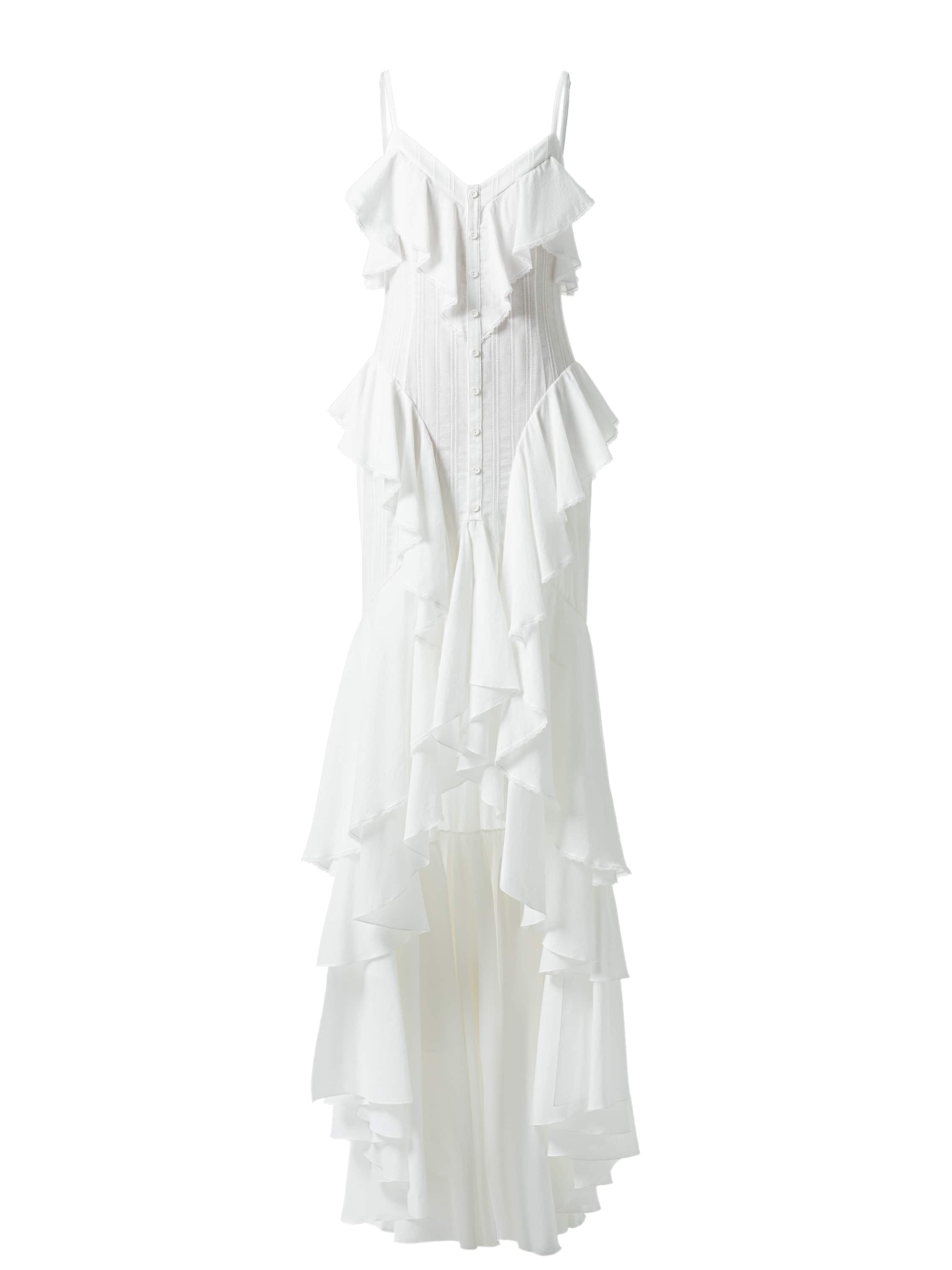 Белое платье-макси выполнено из хлопковой ткани. Модель декорирована рюшами, которые придают силуэту особую воздушность. Застежка на пуговицы спереди.