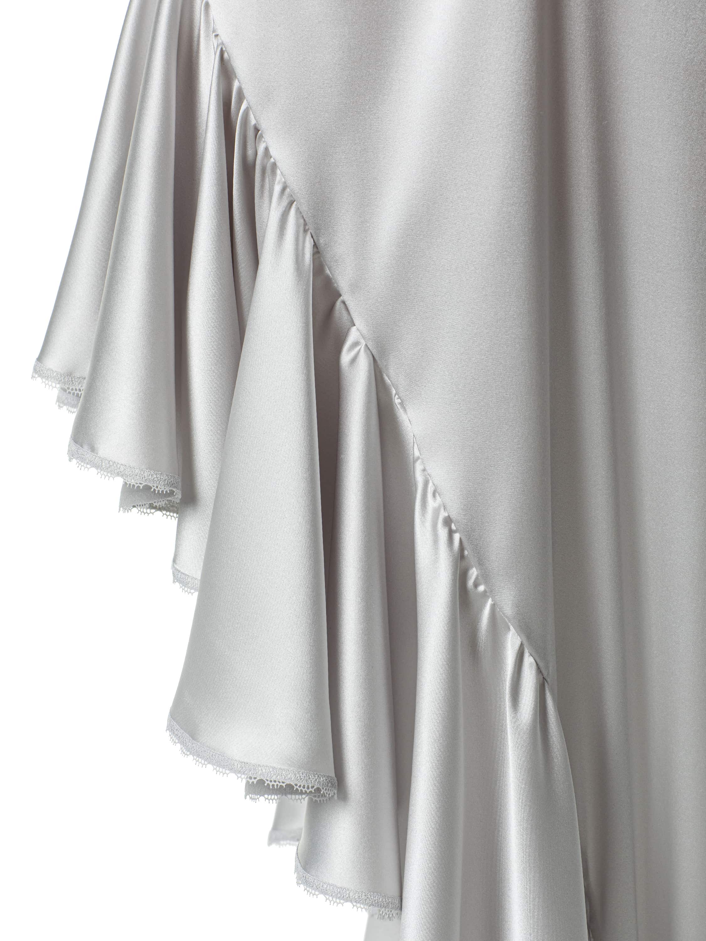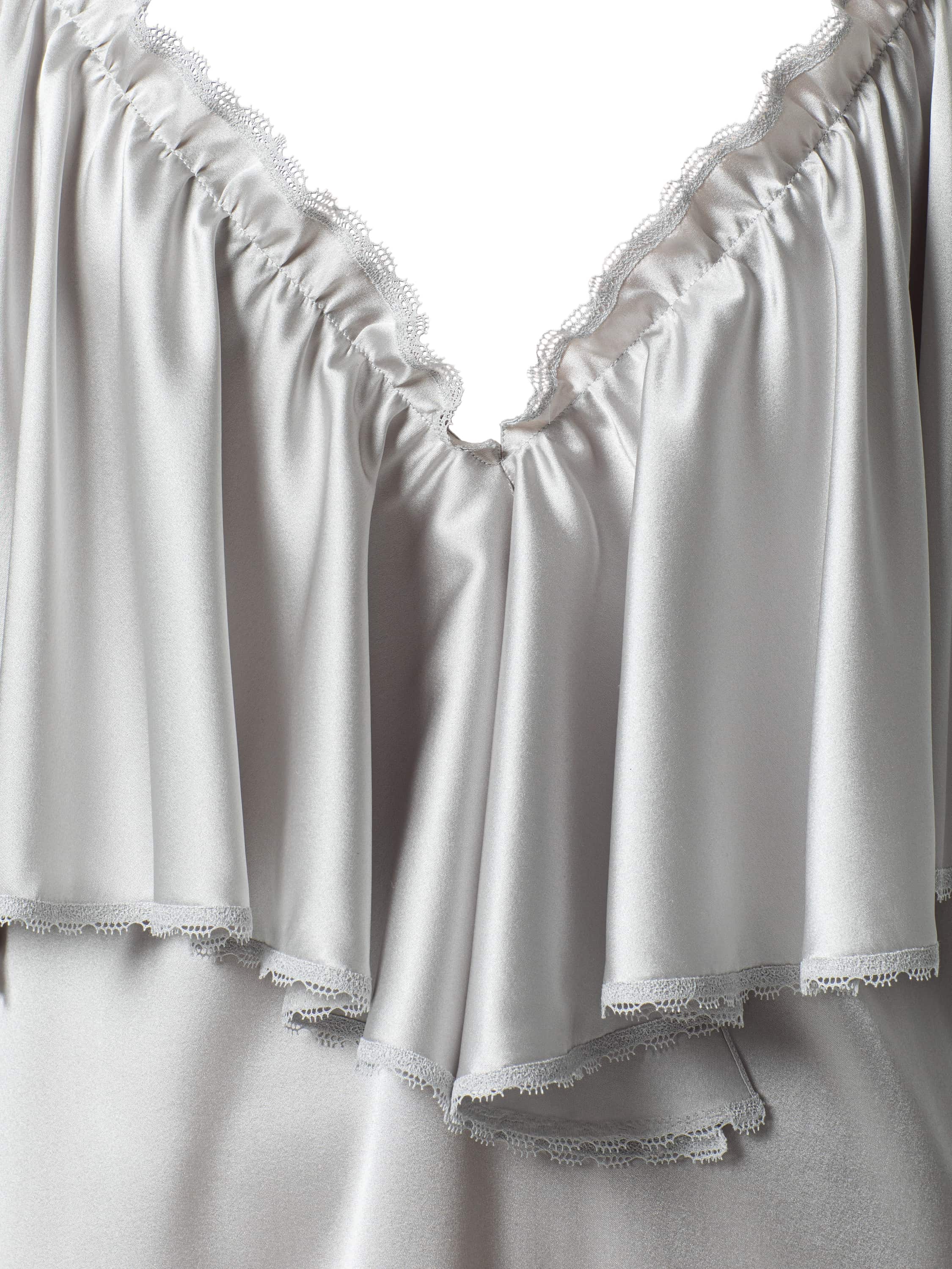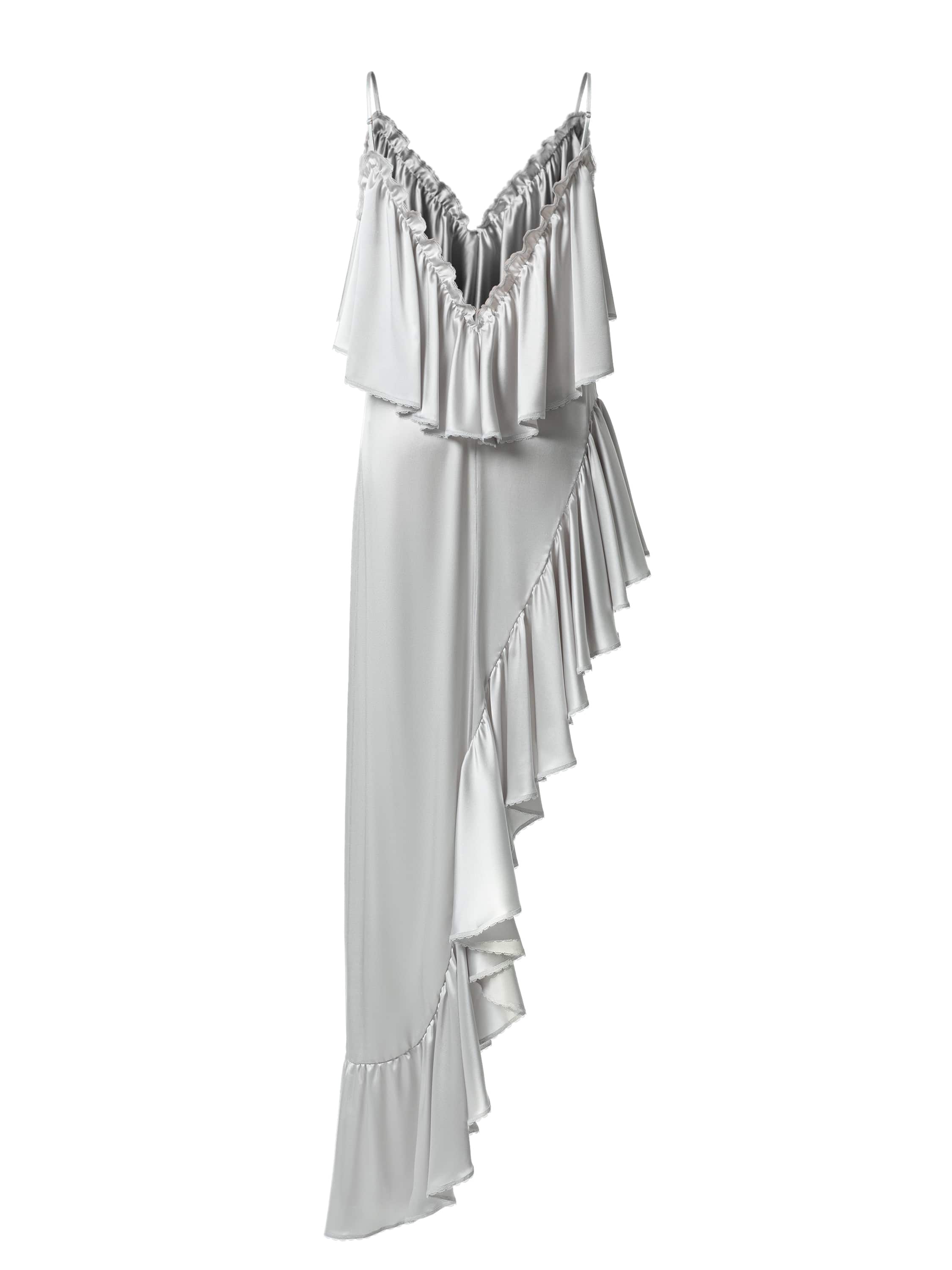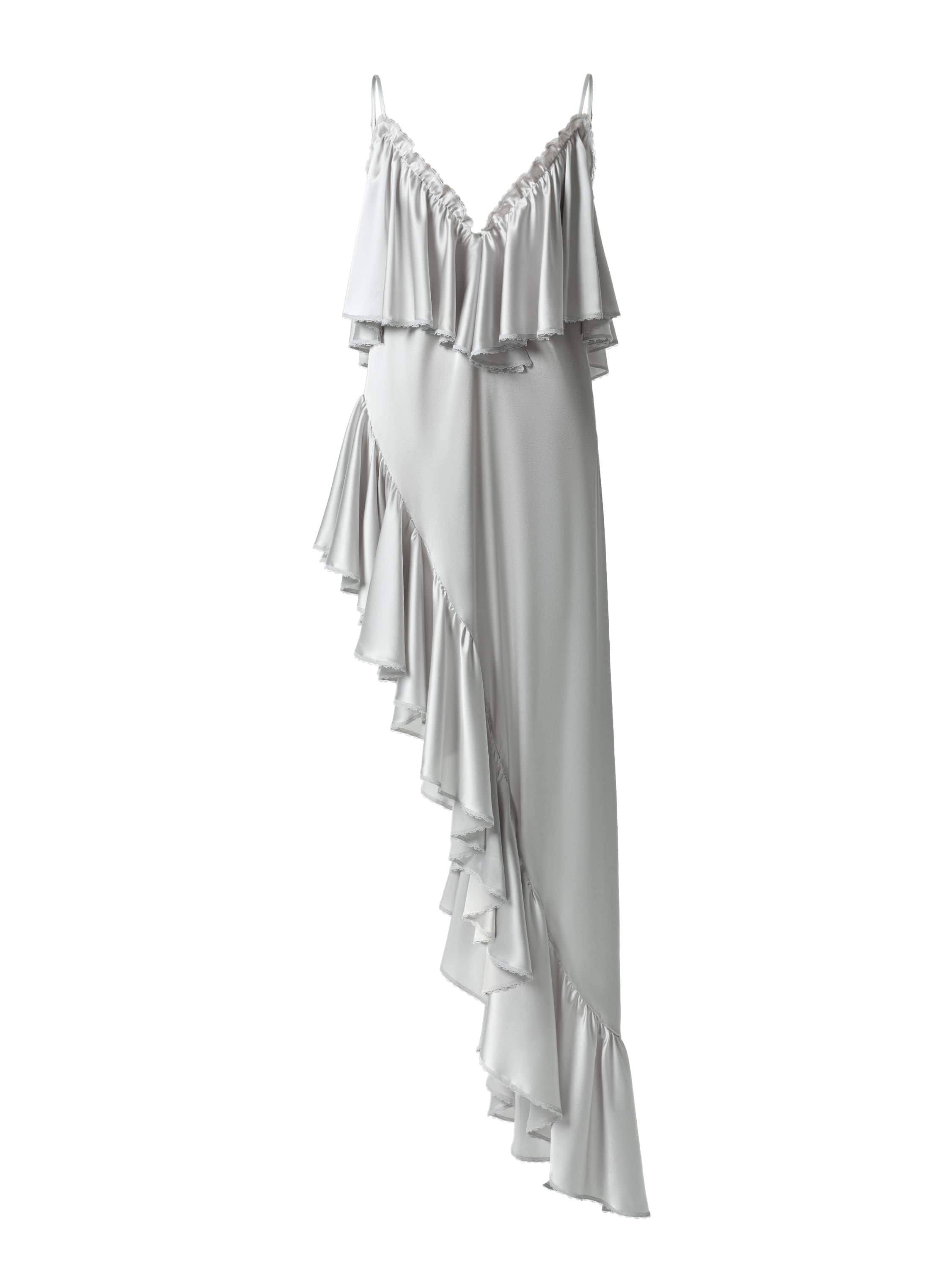 Платье-макси с асимметричным подолом выполнено из шелковой ткани. Модель на тонких бретелях декорирована воланами. 13 часов ручных работ потребовалось мастерам Модного дома YANA на работу с кружевом.
