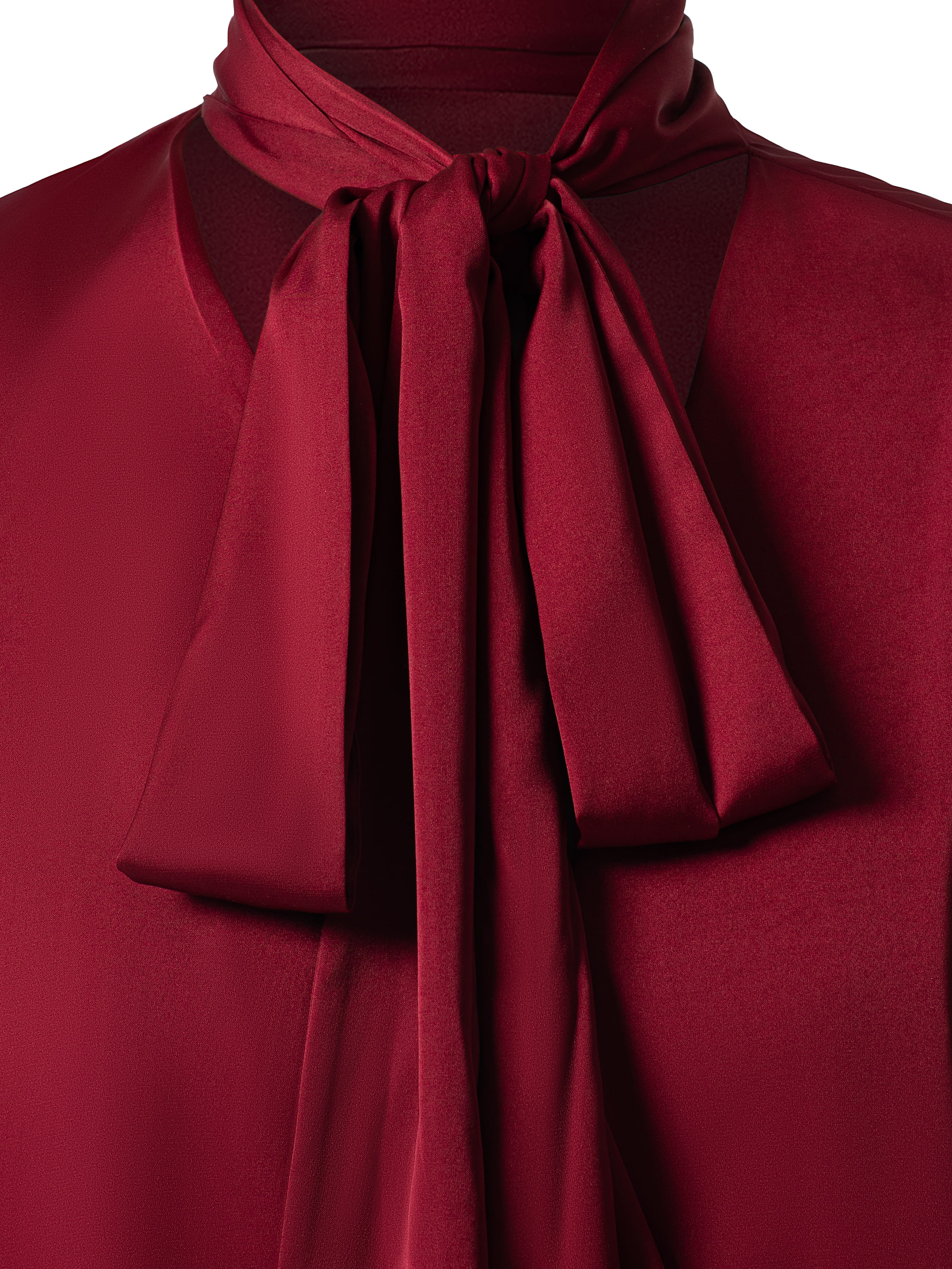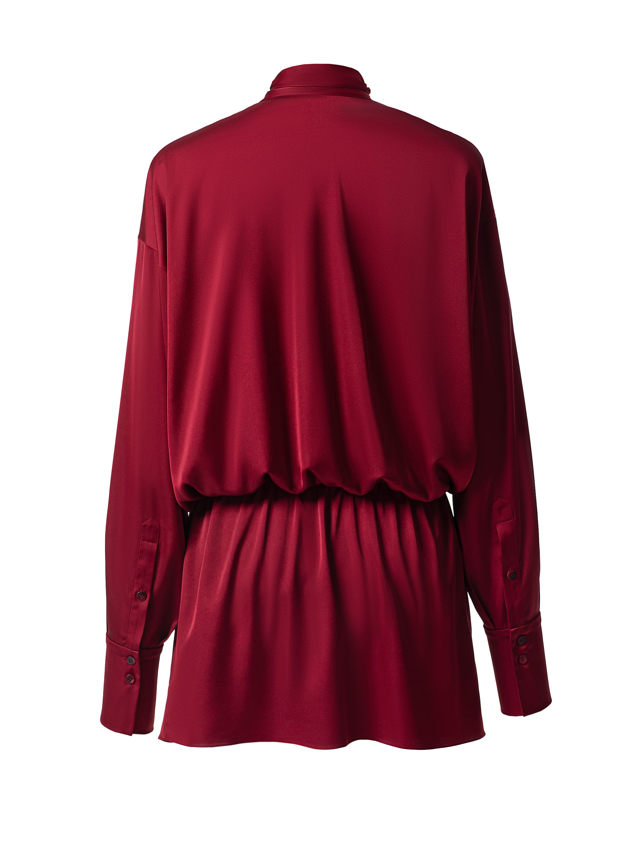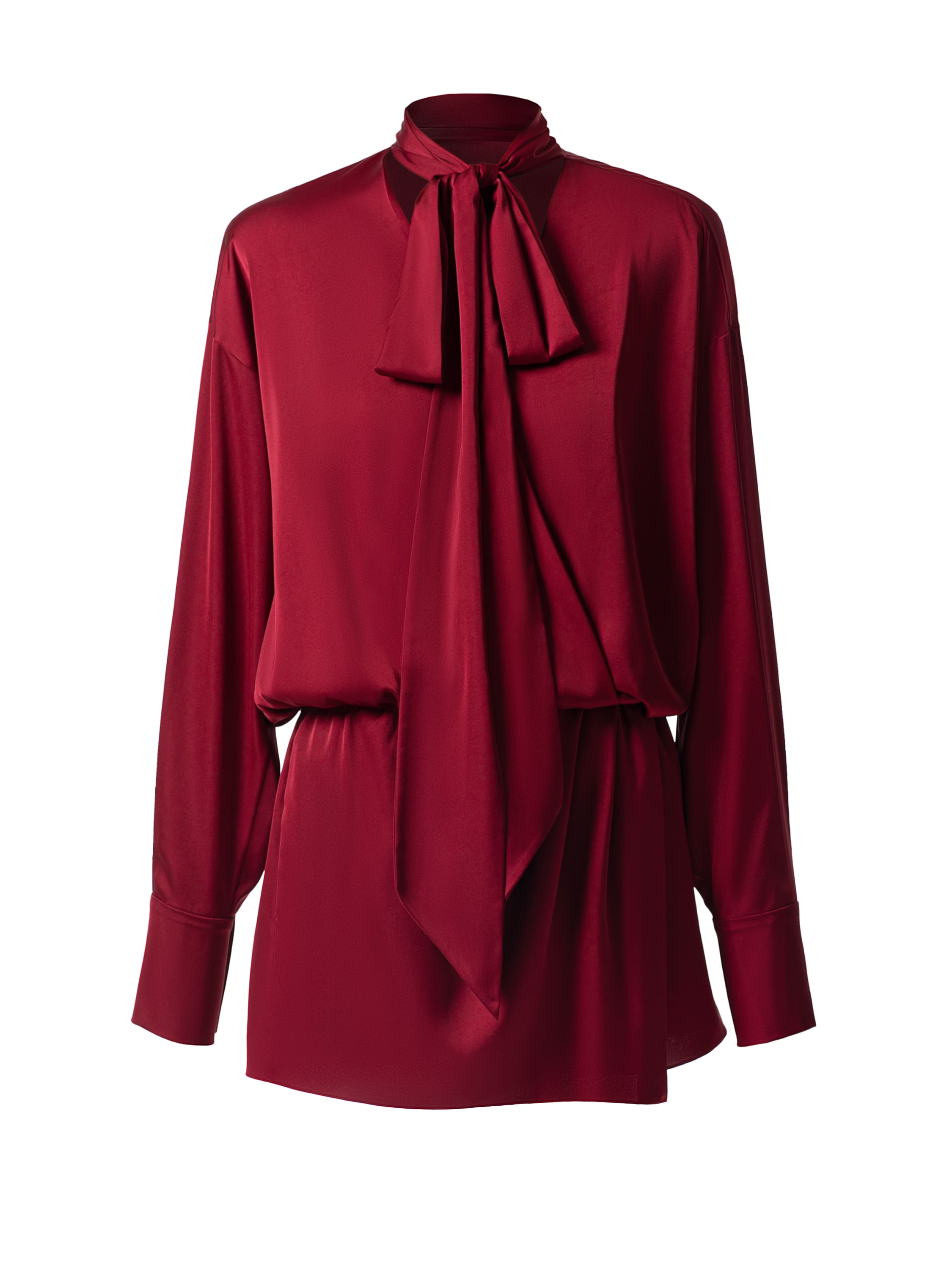 Минималистичное платье-мини на запах выполнено из бордового атласа. Модель украсили воротником-шарфом, который можно драпировать по‑разному — это позволяет менять образ.