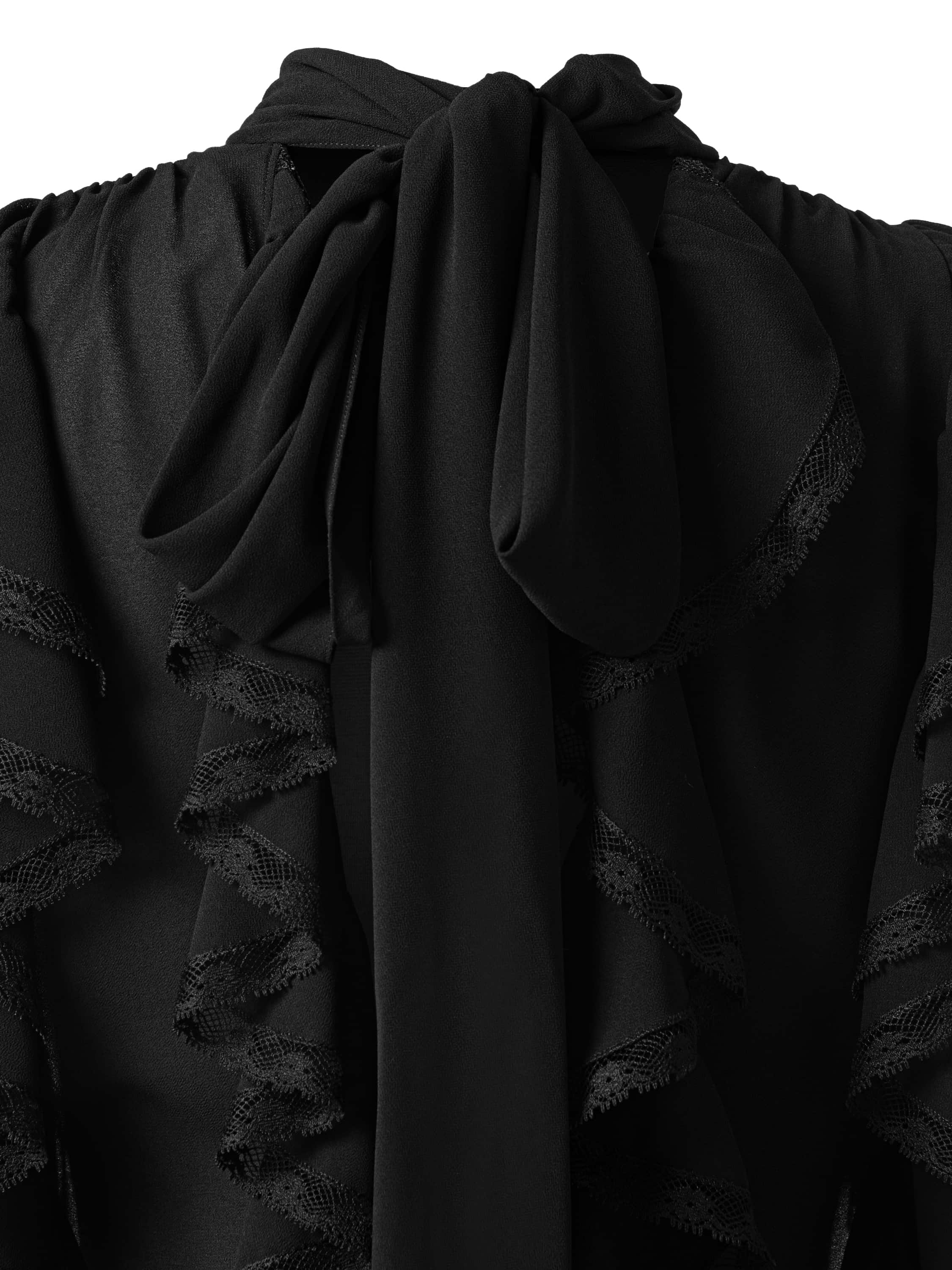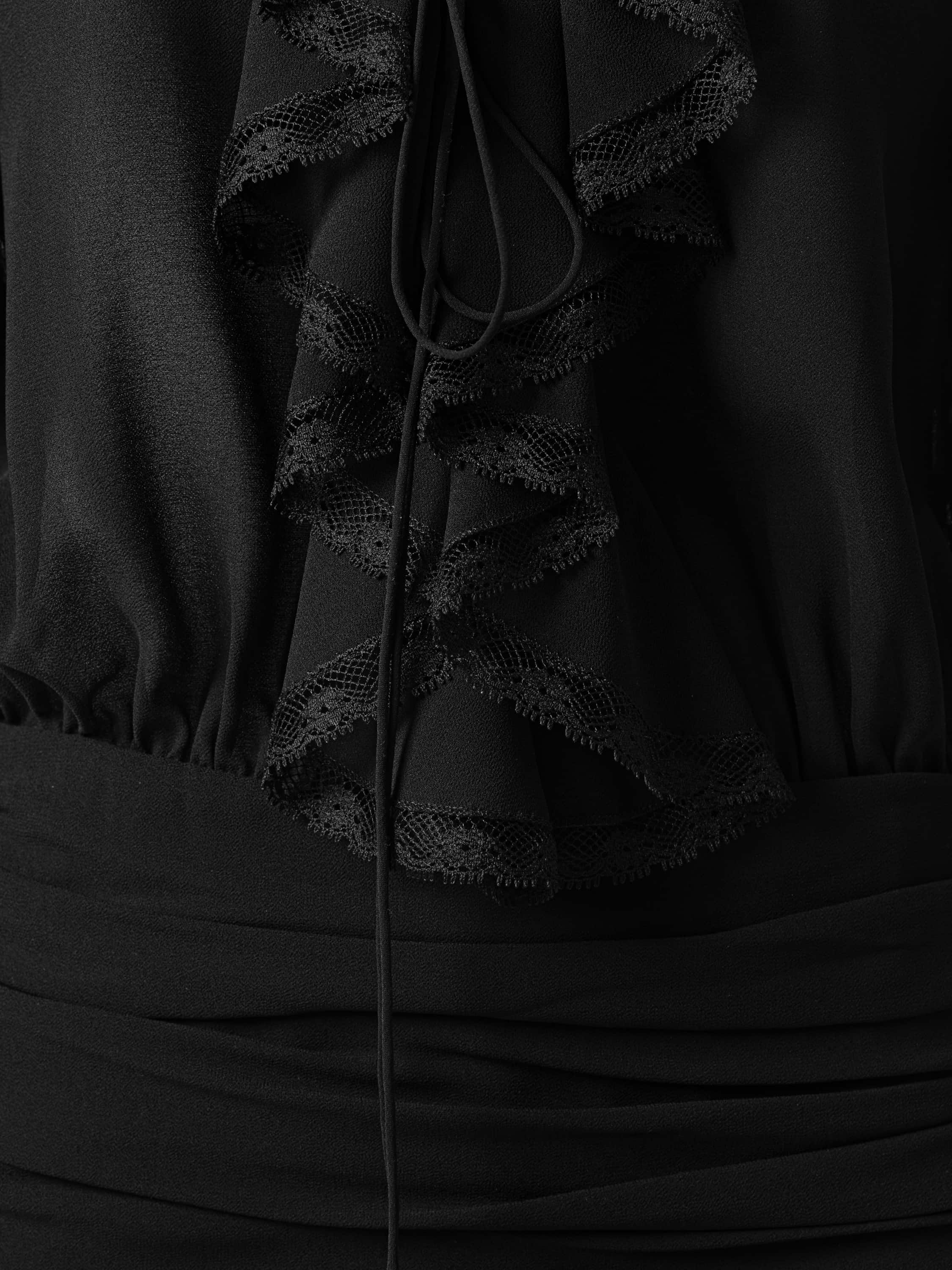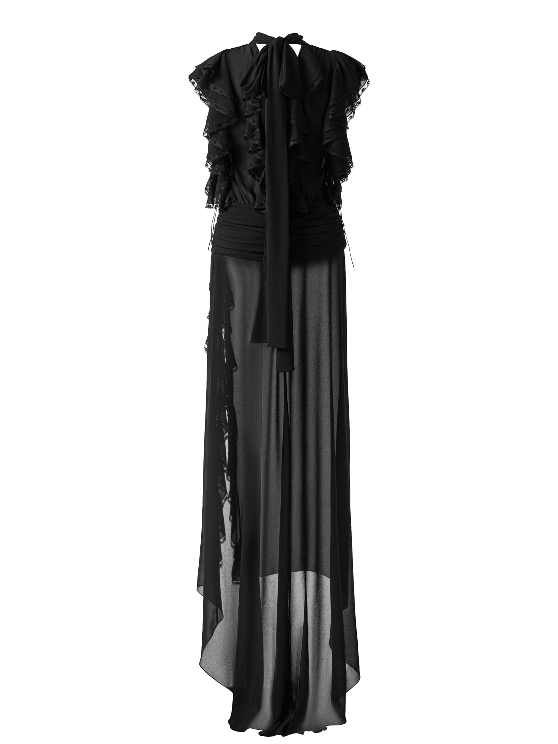 Черное платье-макси выполнено из полупрозрачного шифона. Модель дополнена воланами с кружевом на груди и драпировками на талии. Воротник-аскот завязывается в элегантный бант.