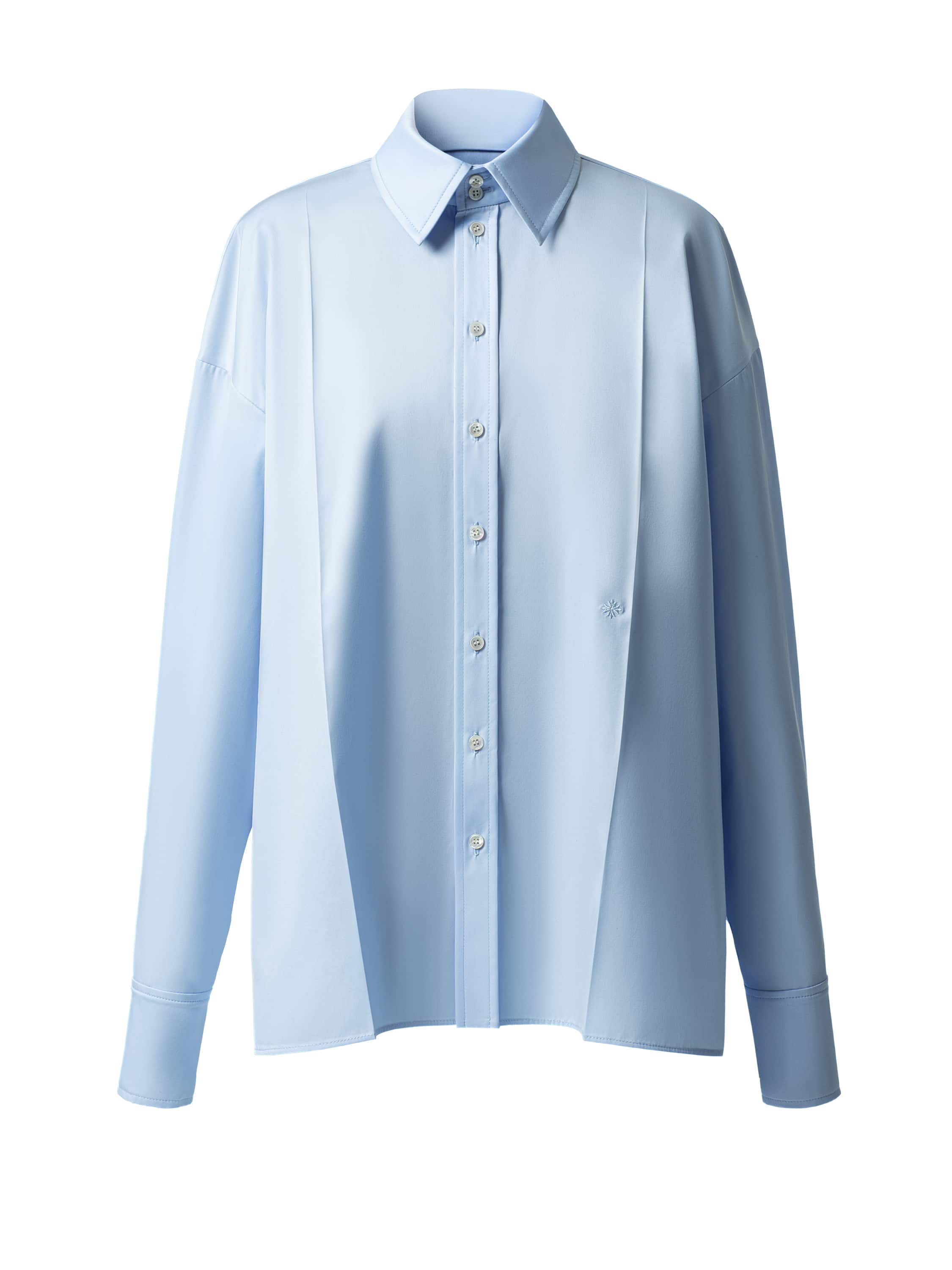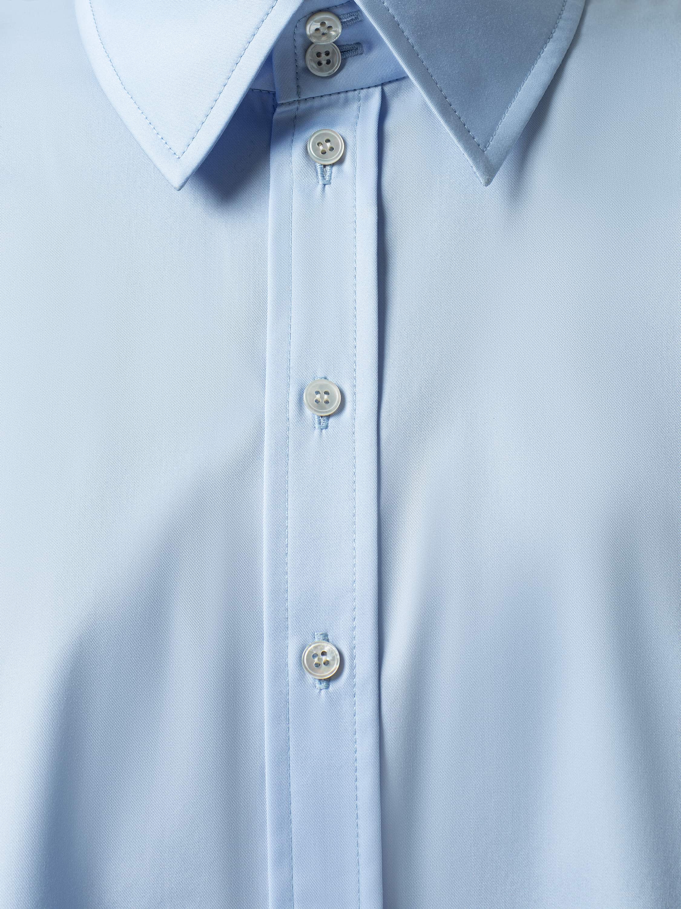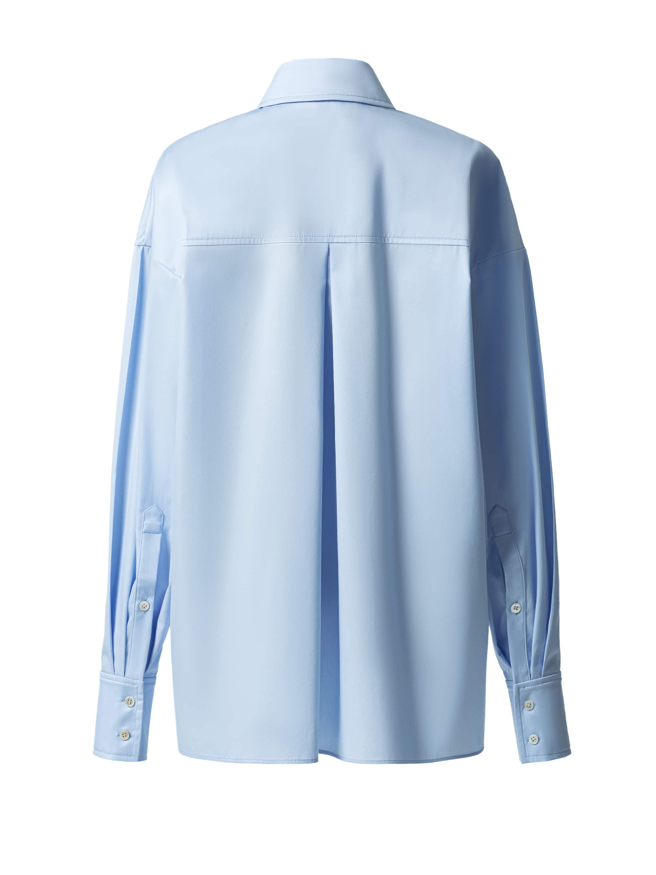 Классическая однотонная голубая рубашка выполнена из хлопковой ткани. Модель украсили минималистичной вышивкой в виде василька.