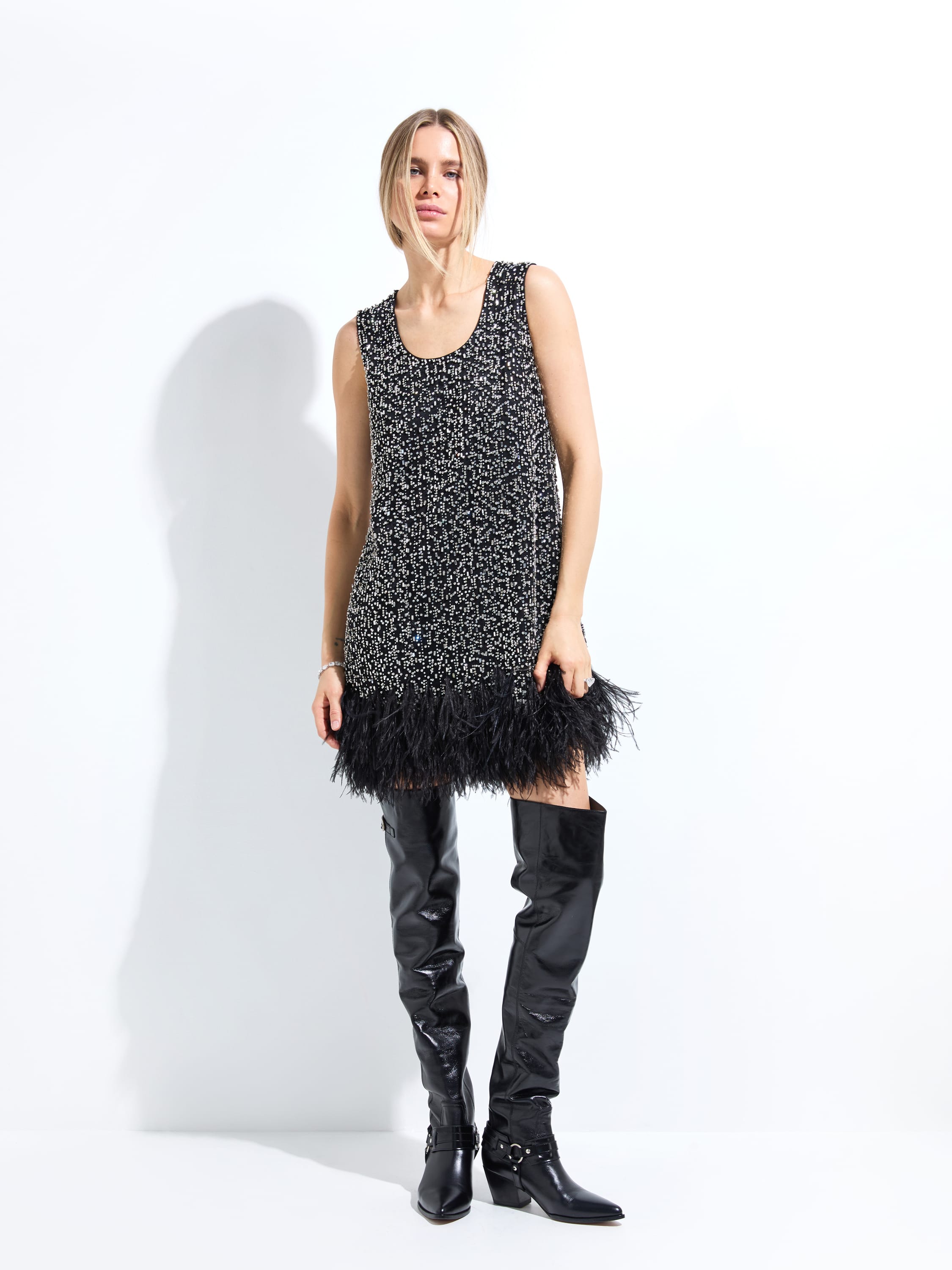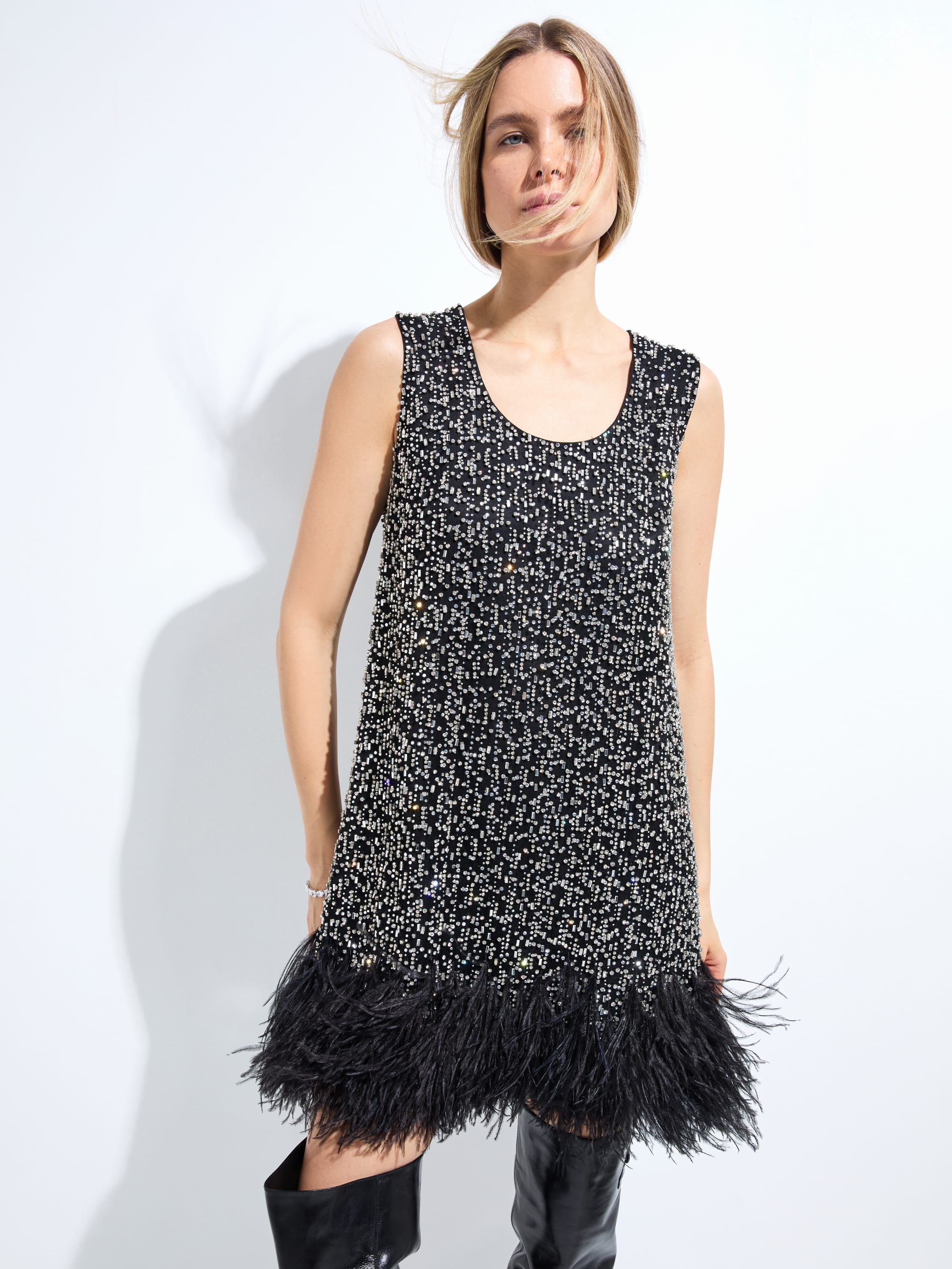 Платье-мини с кристаллами и перьями