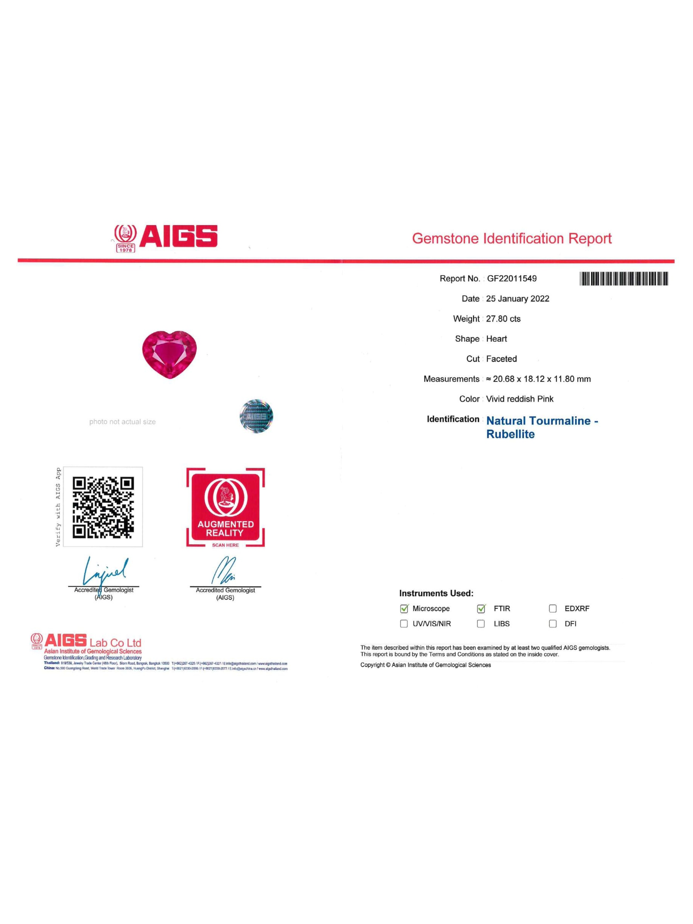 Колье из белого золота с рубеллитом огранки «сердце» весом 27.8 кт, 927 бриллиантами круглой огранки общим весом 15.8 кт, 10 рубеллитами огранки «груша» общим весом 7.28 кт, 1 рубином круглой огранки весом 0.05 кт.