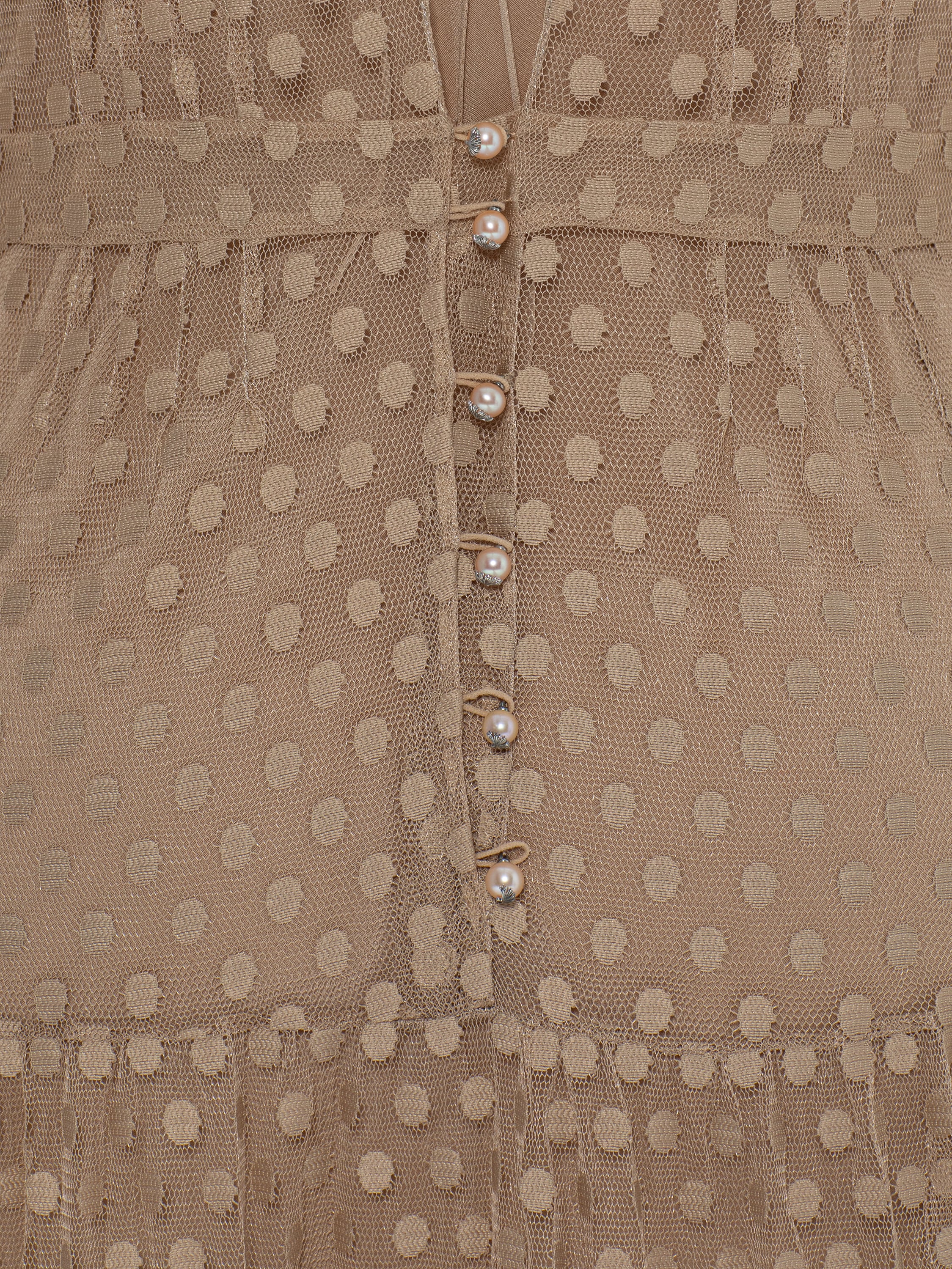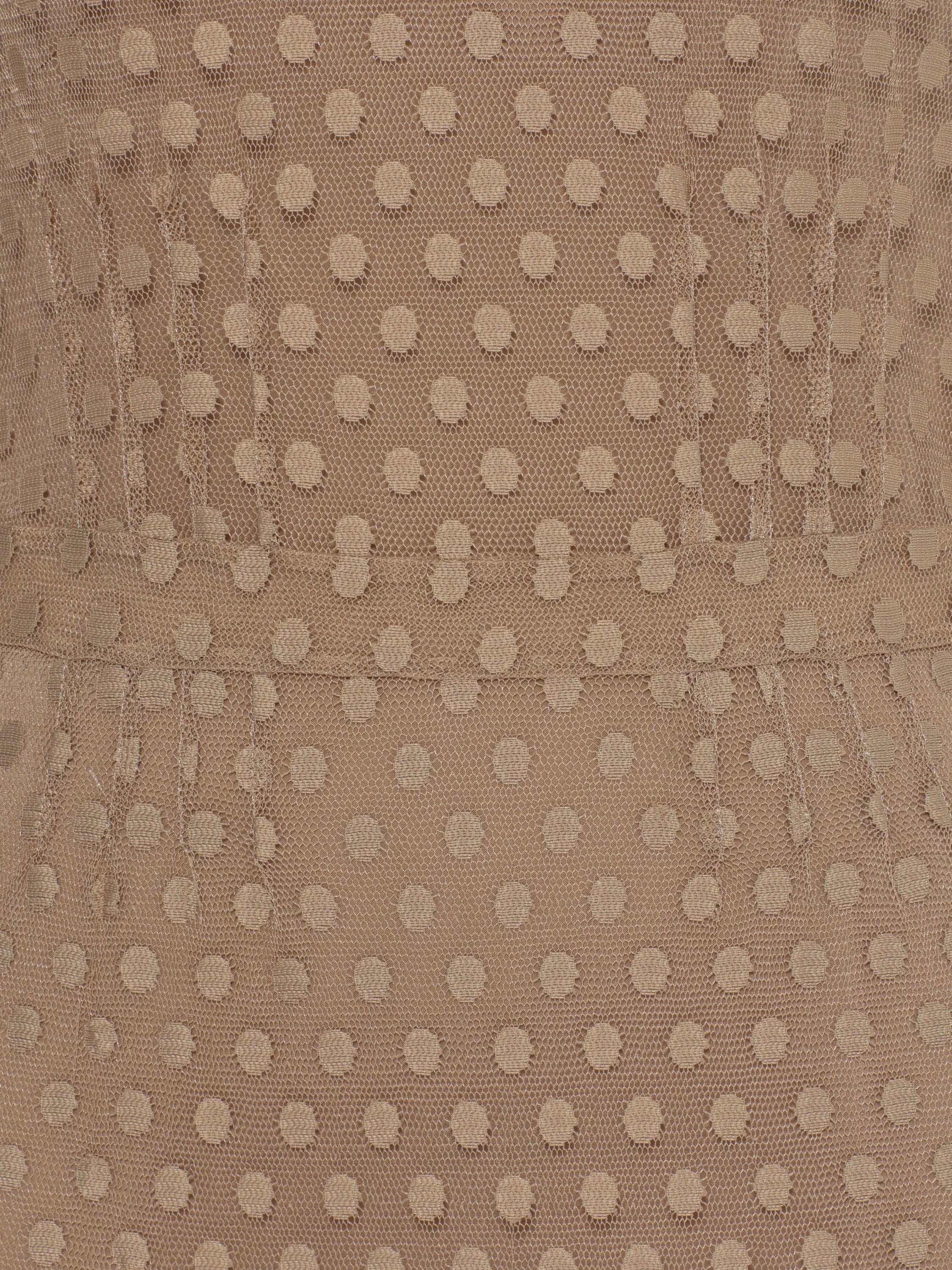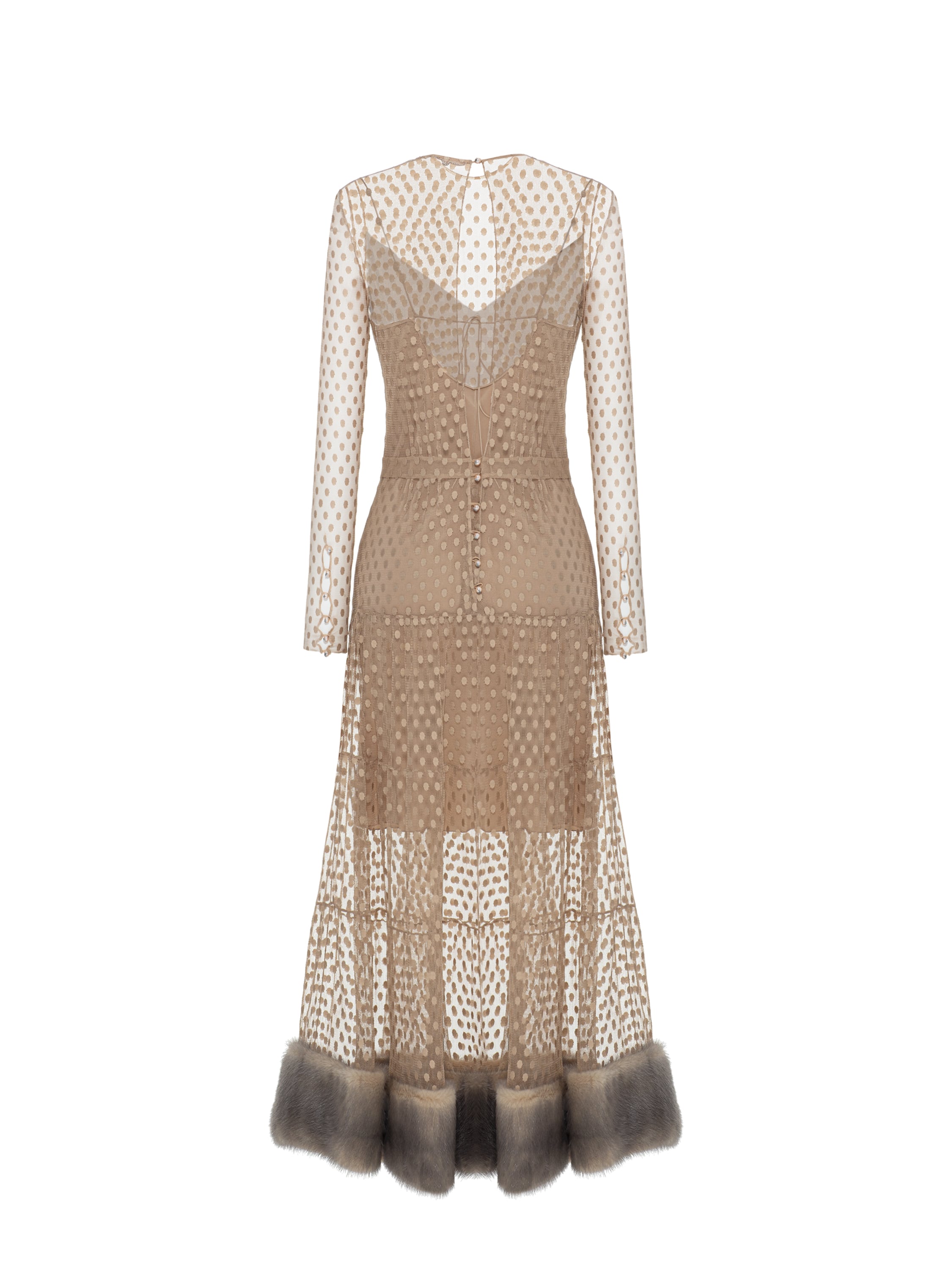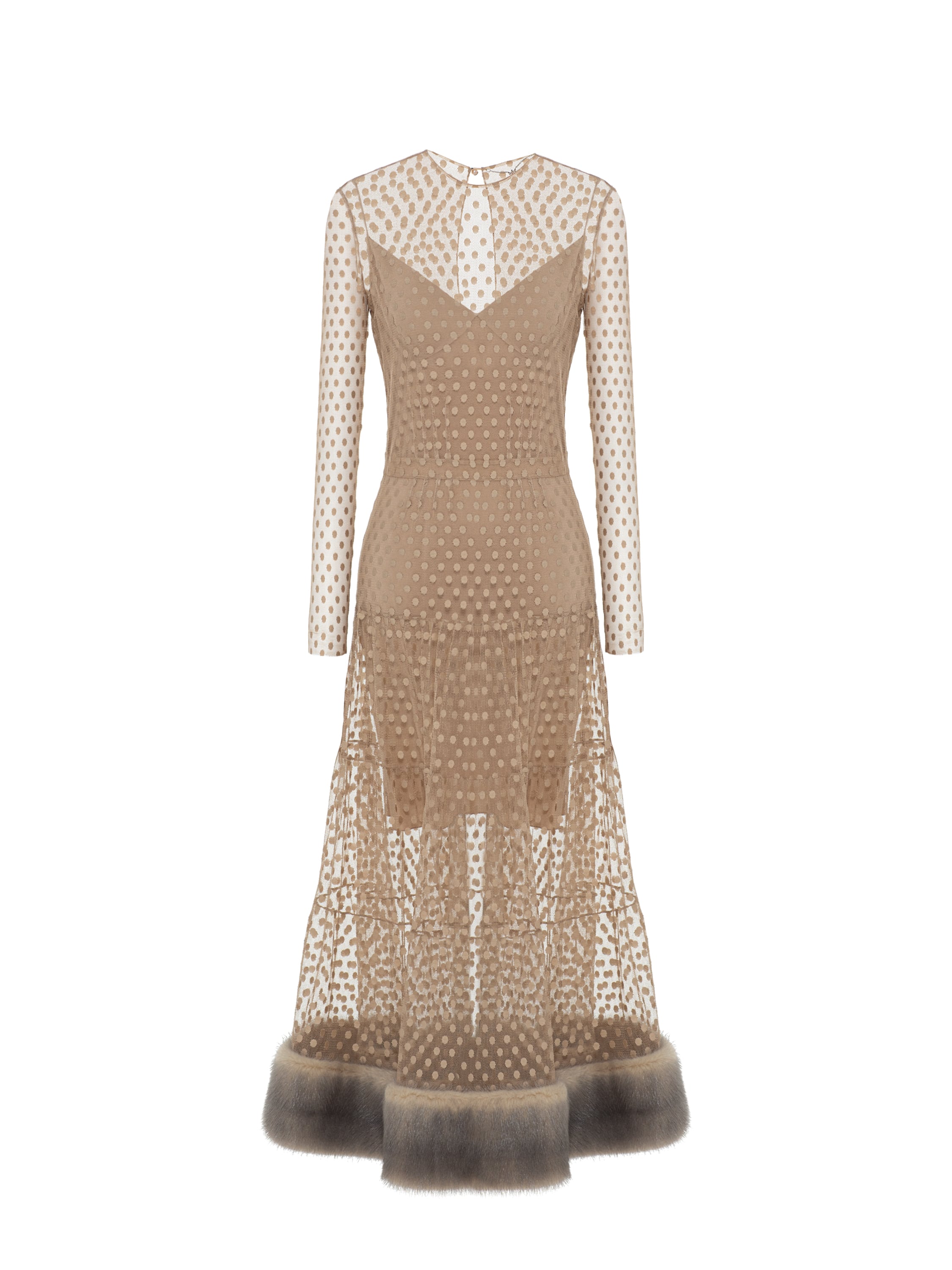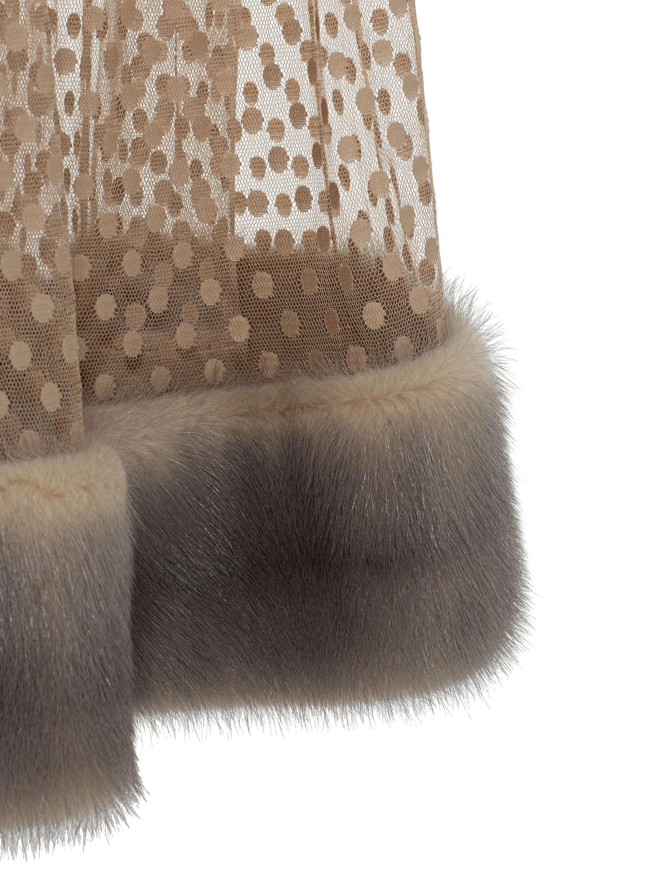 Бежевое платье из сетки с мехом норки