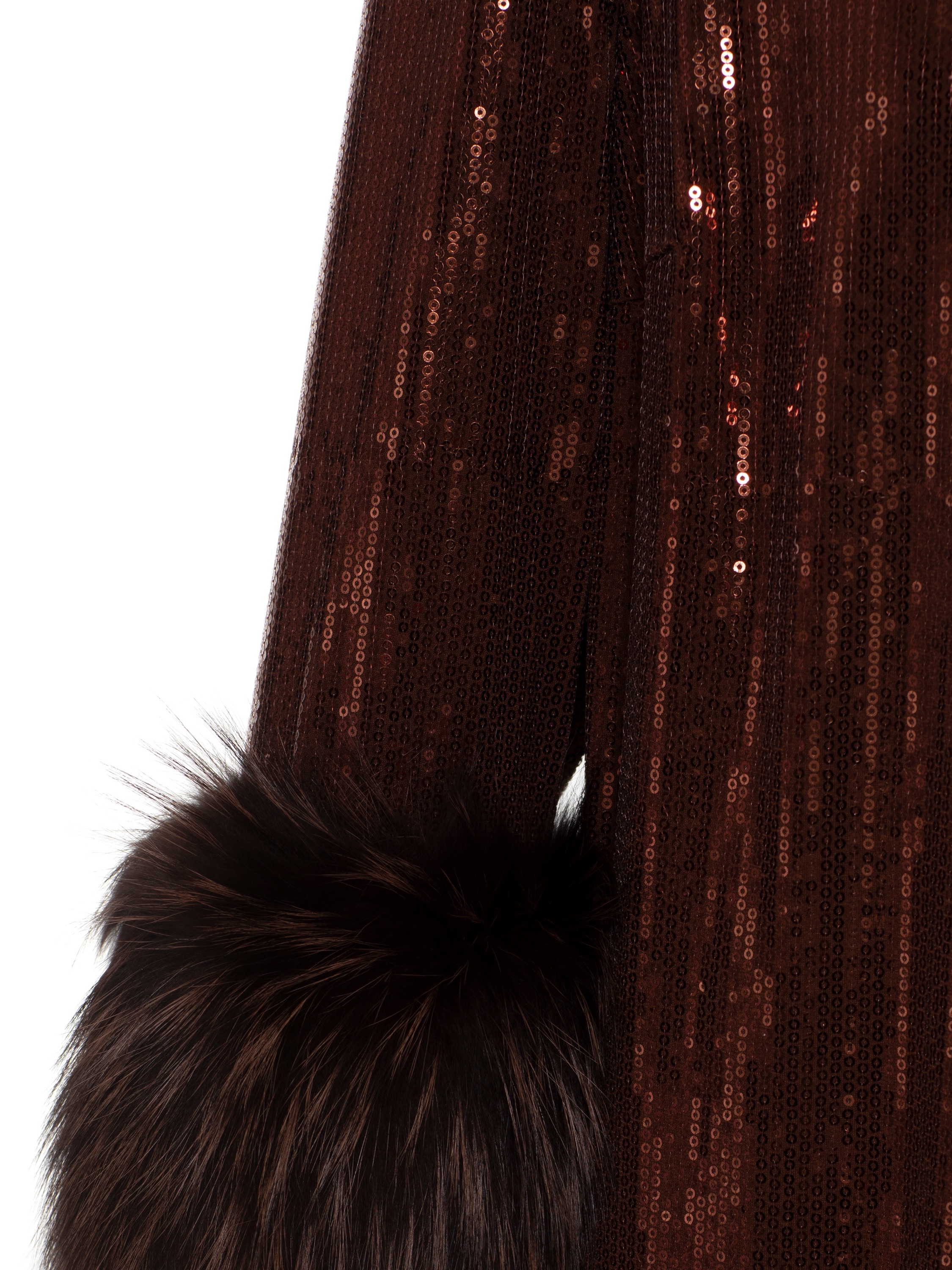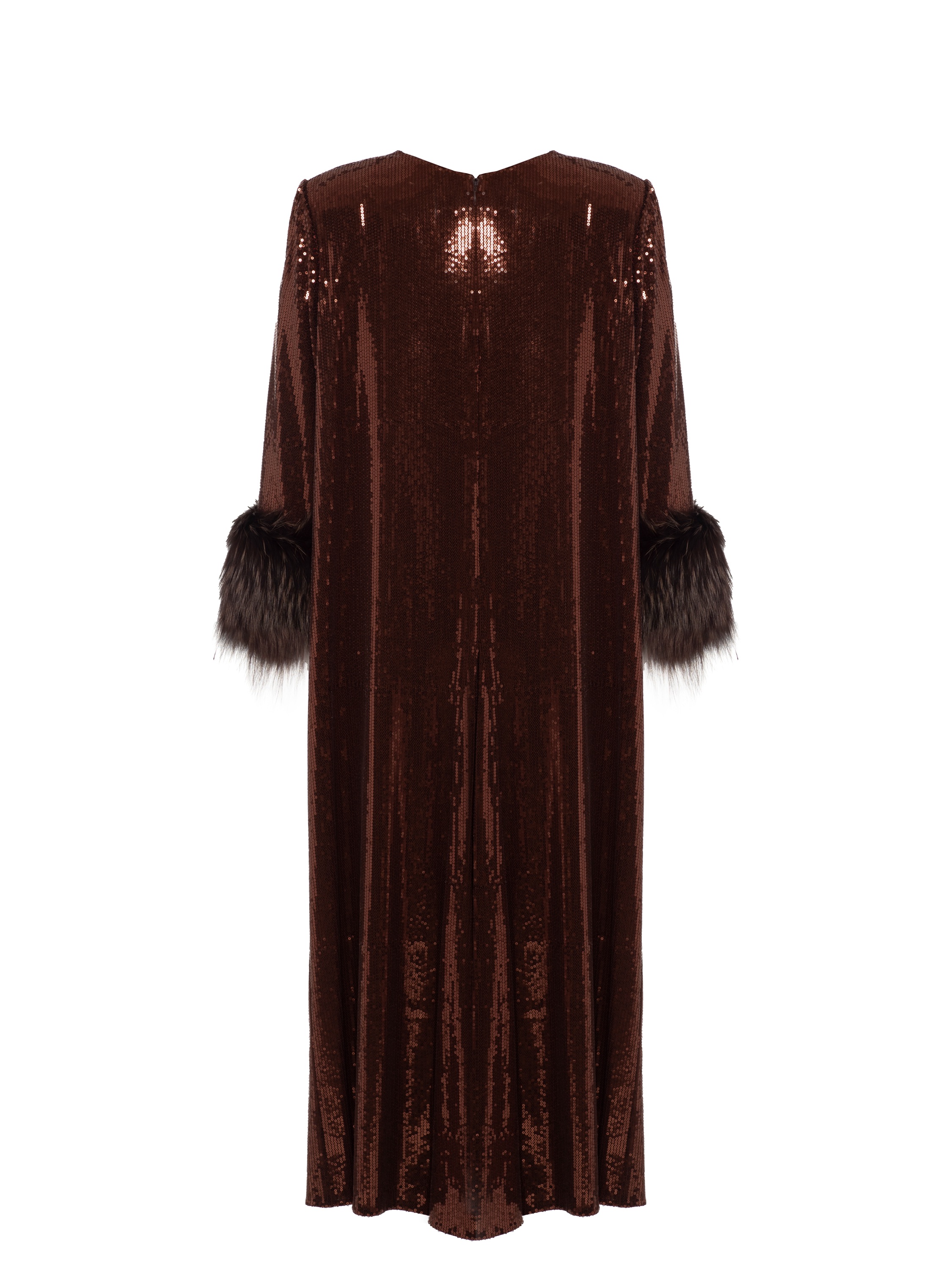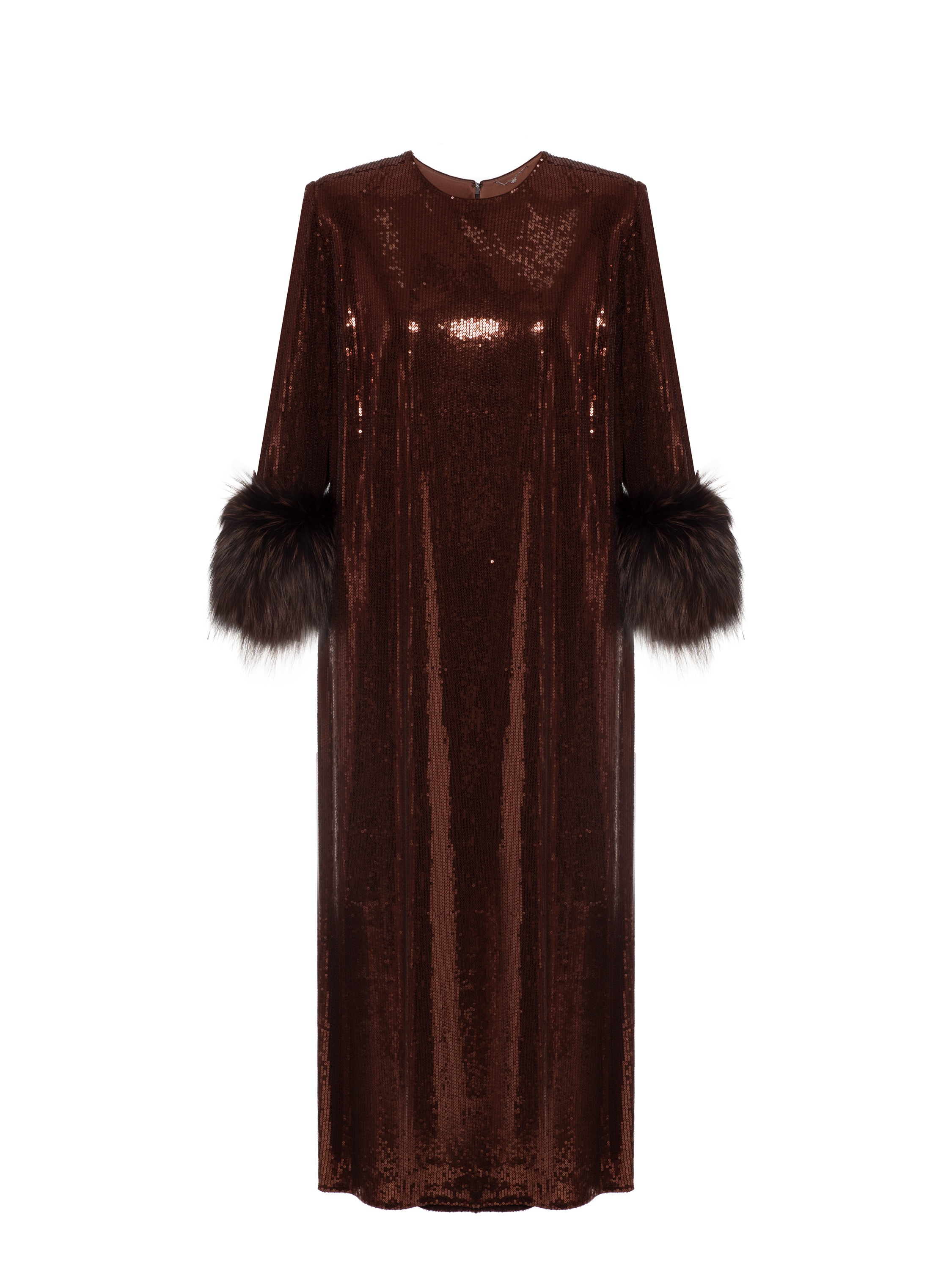 Коричневое платье-миди с пайетками и меховыми манжетами