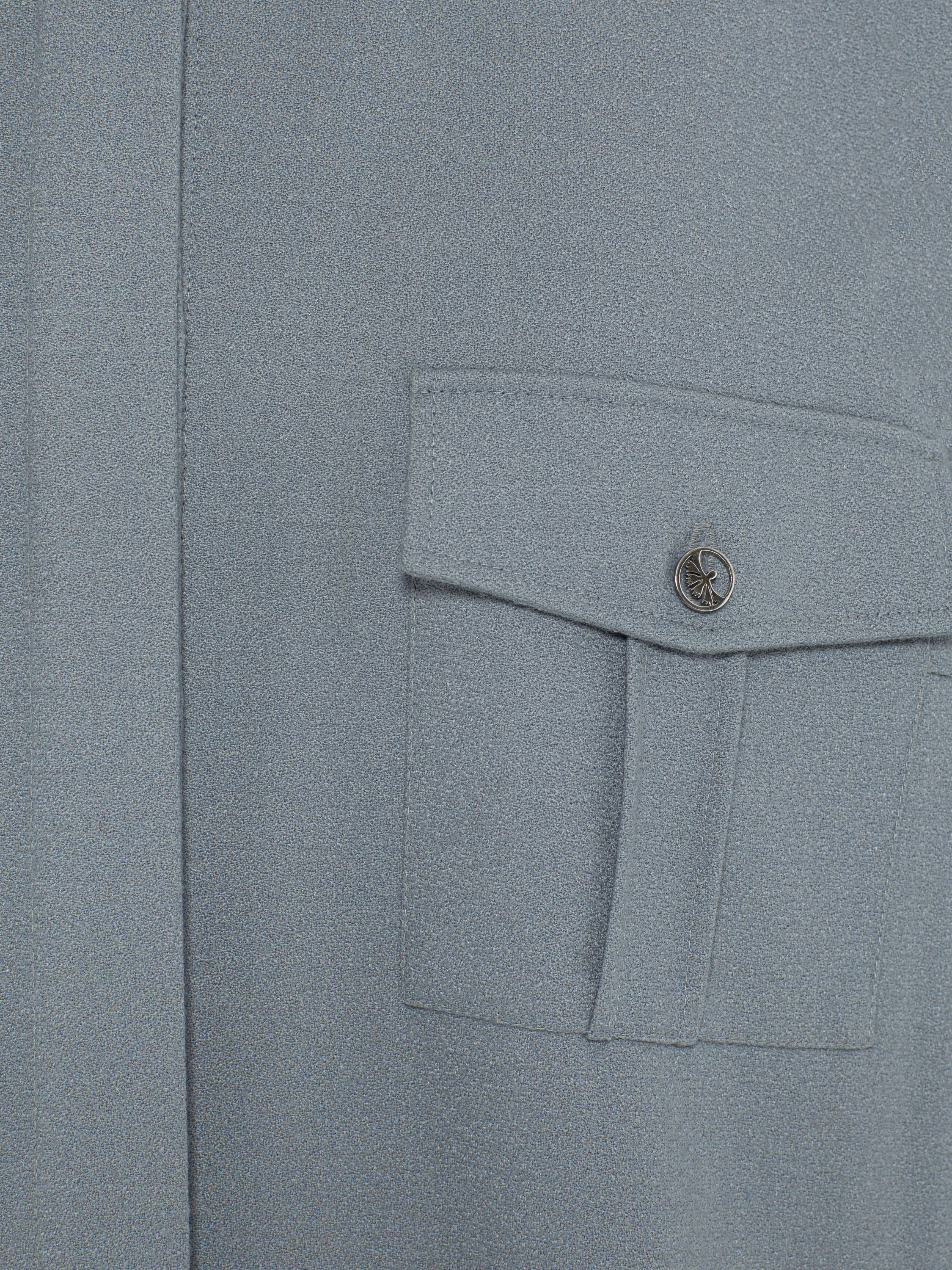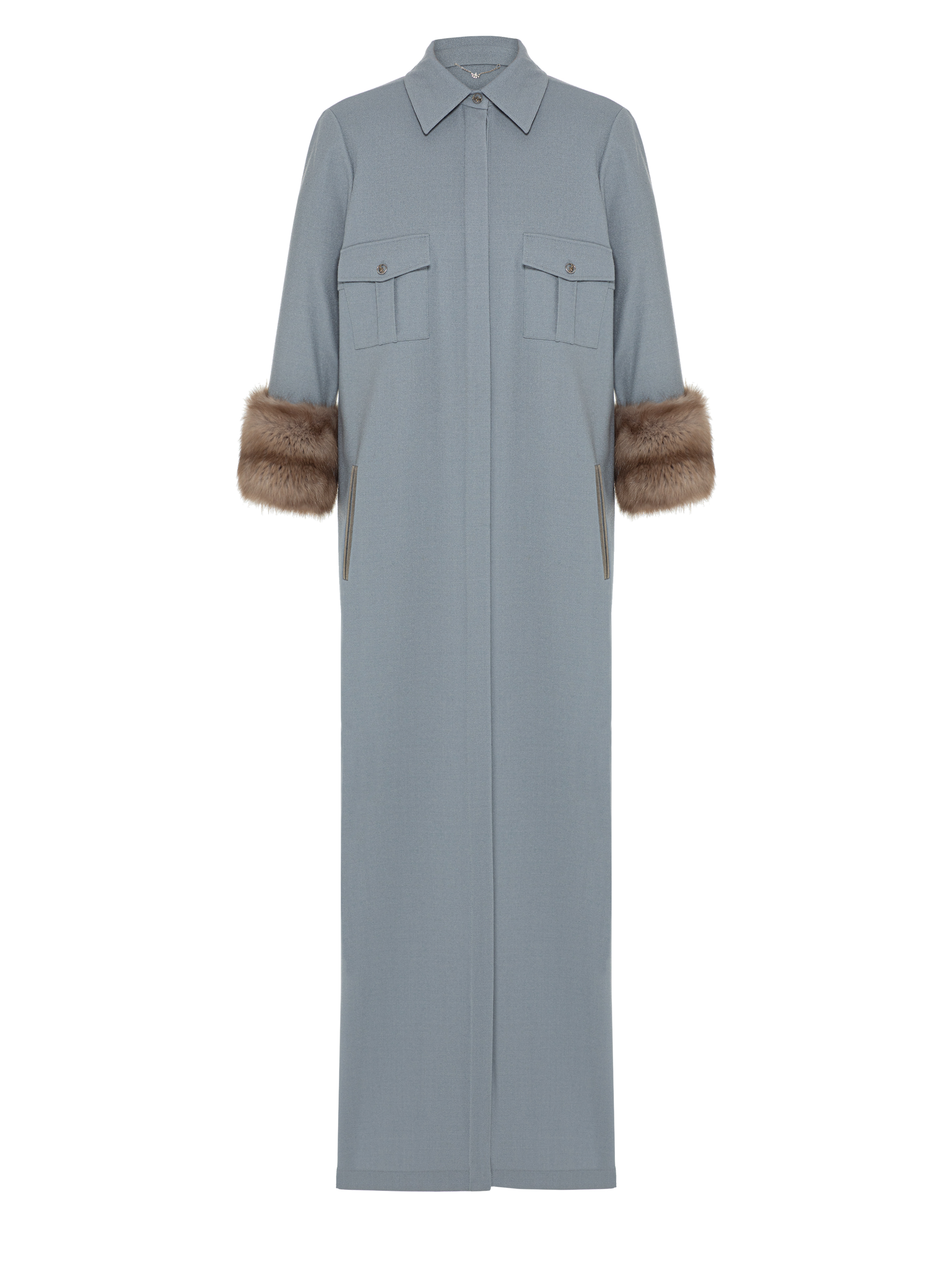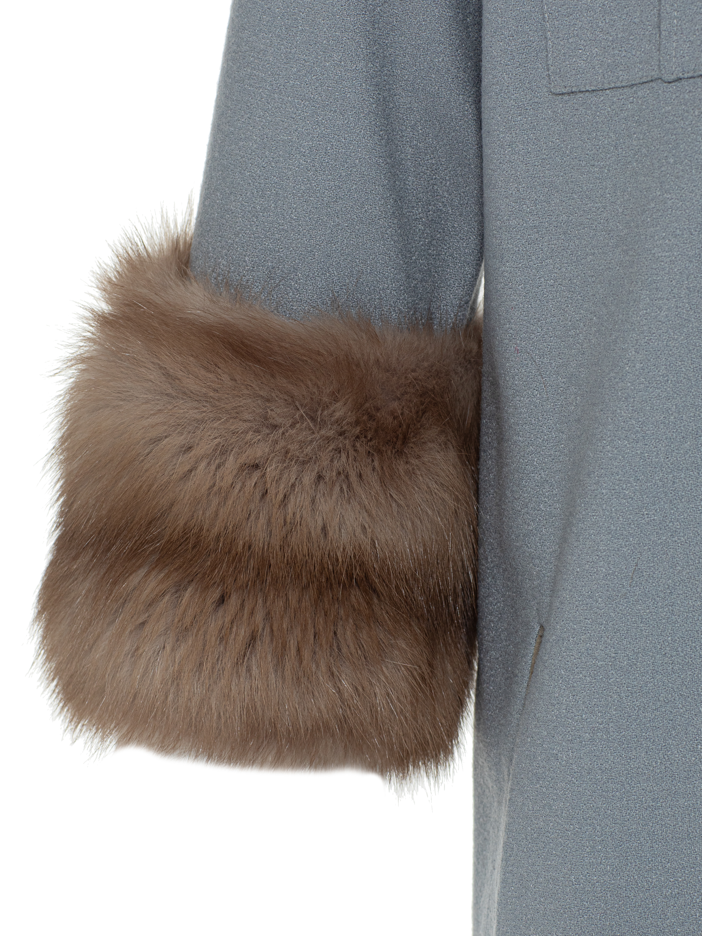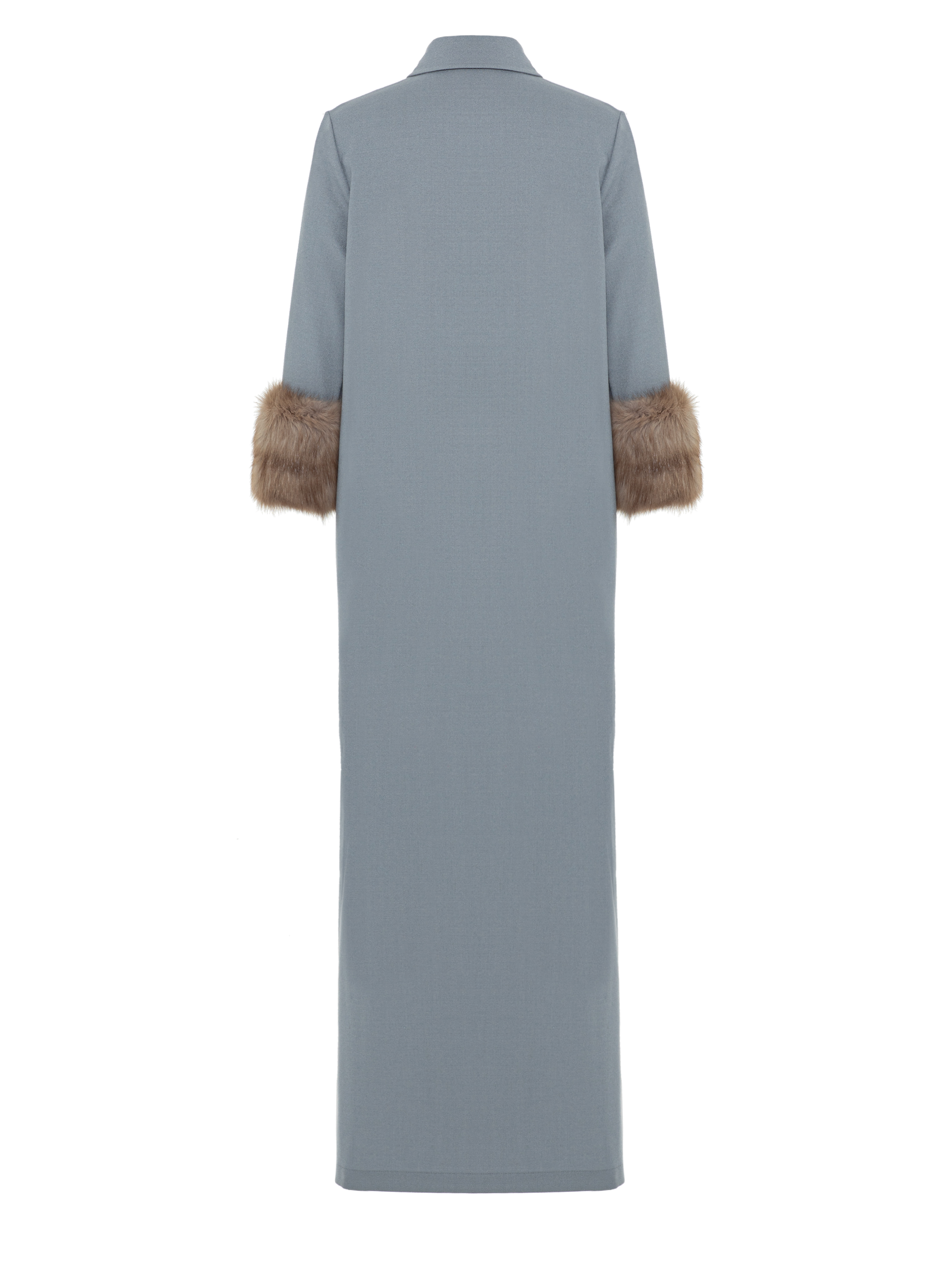 Серое платье-макси из костюмной ткани с меховыми манжетами