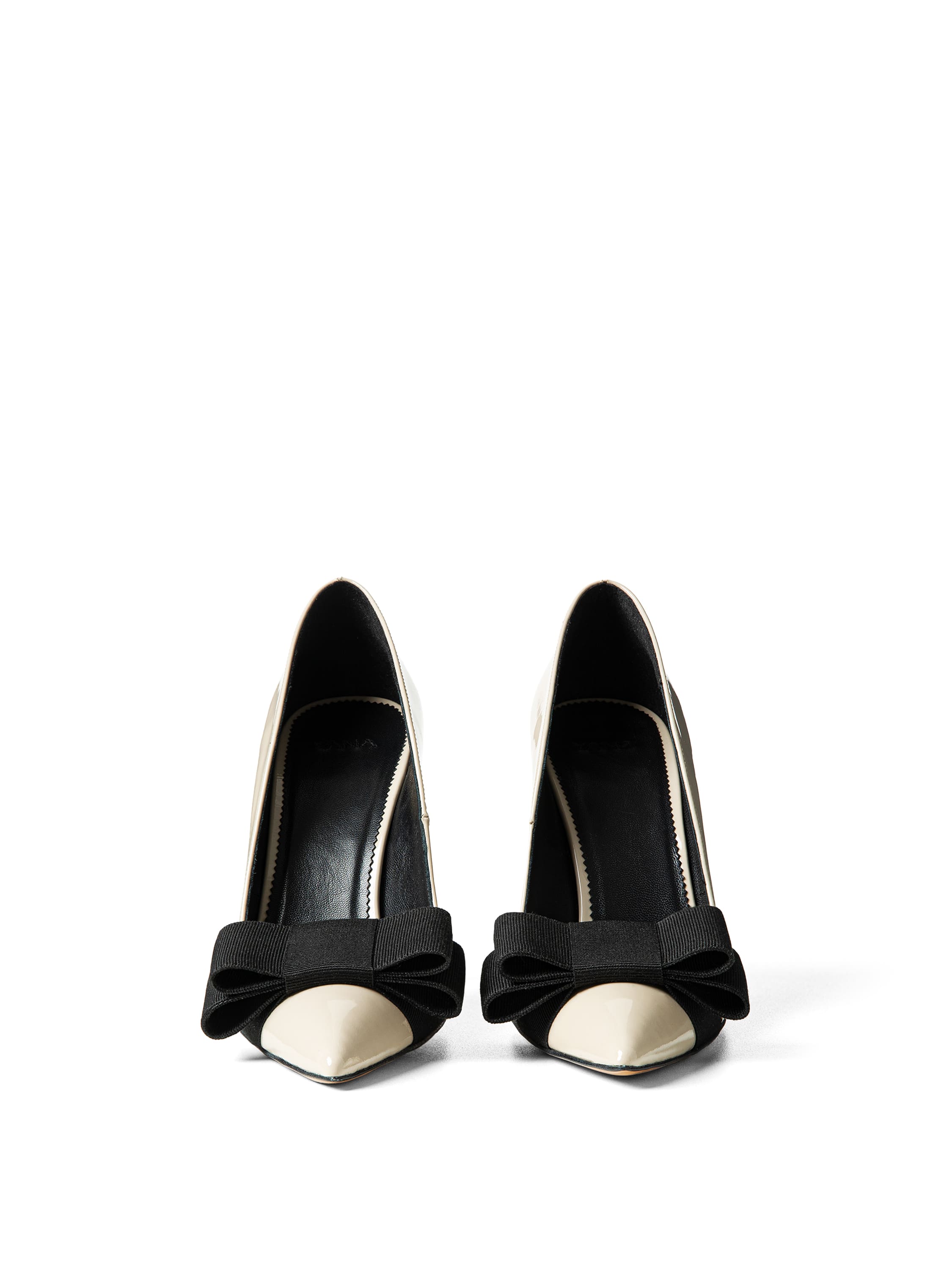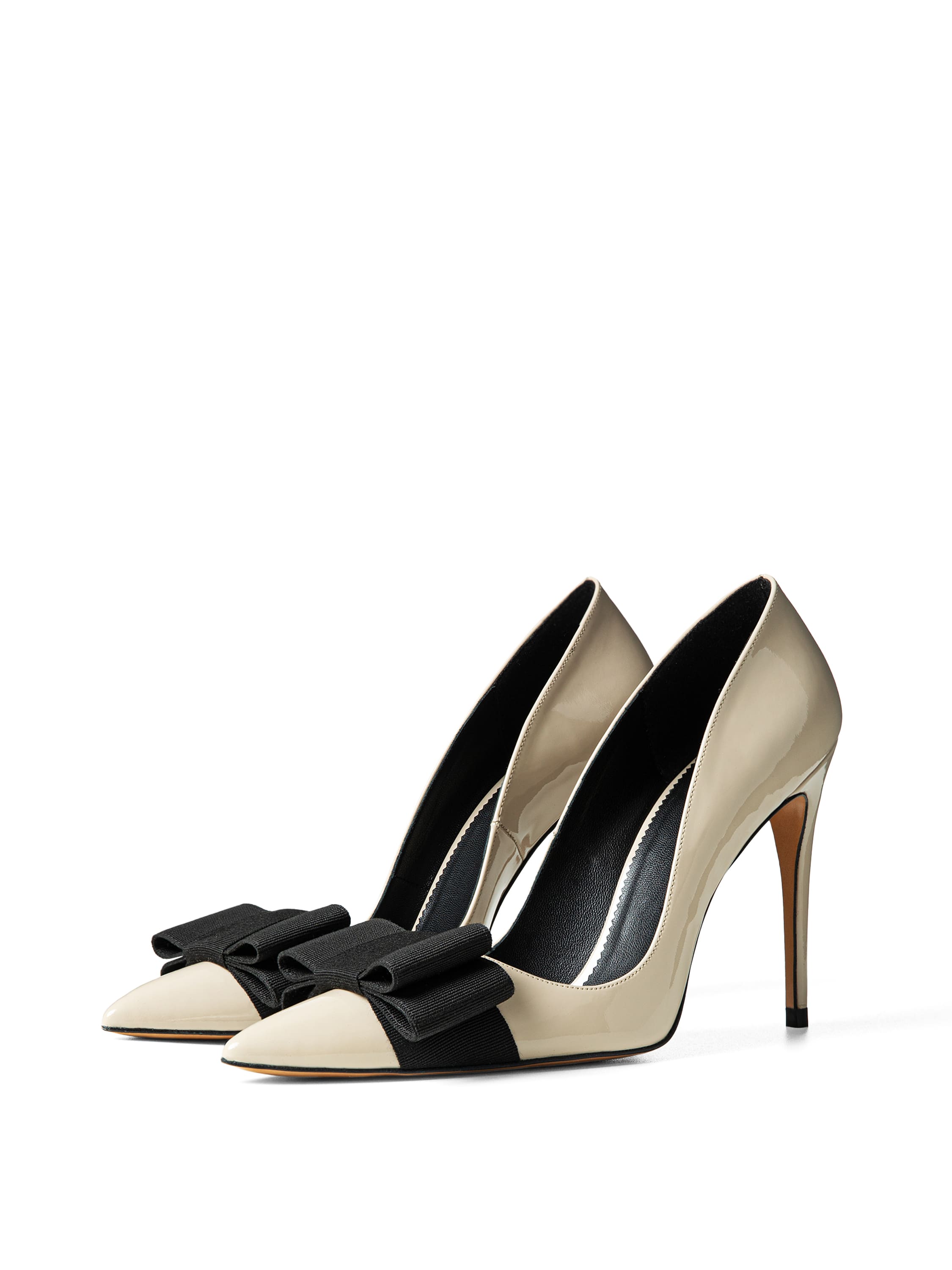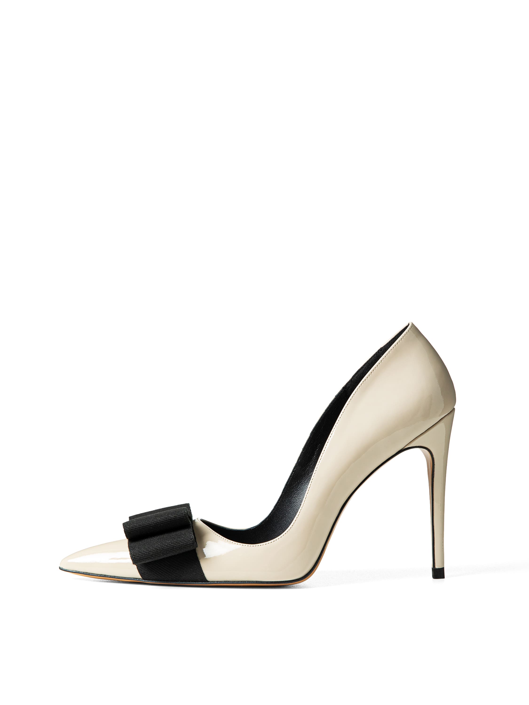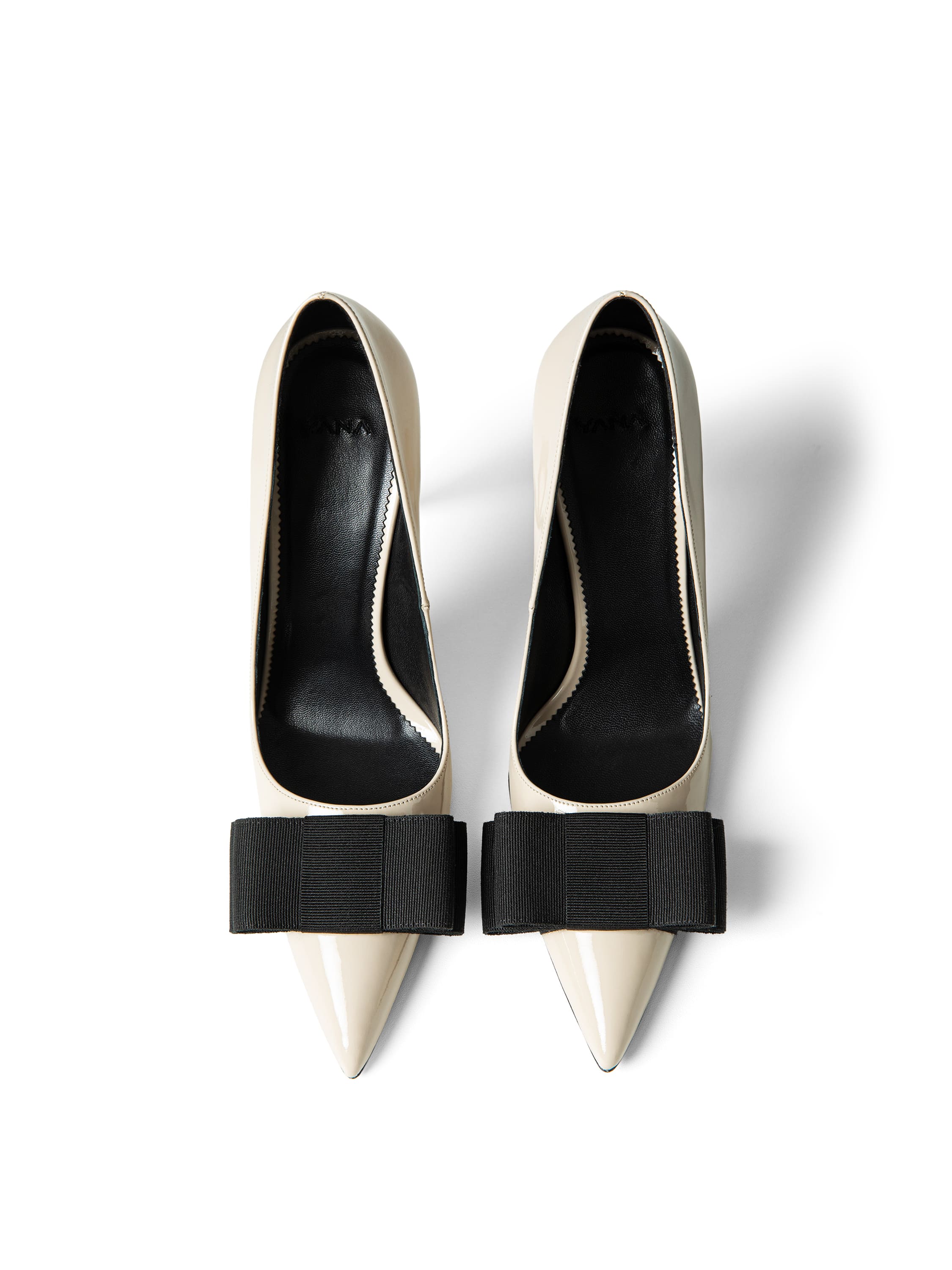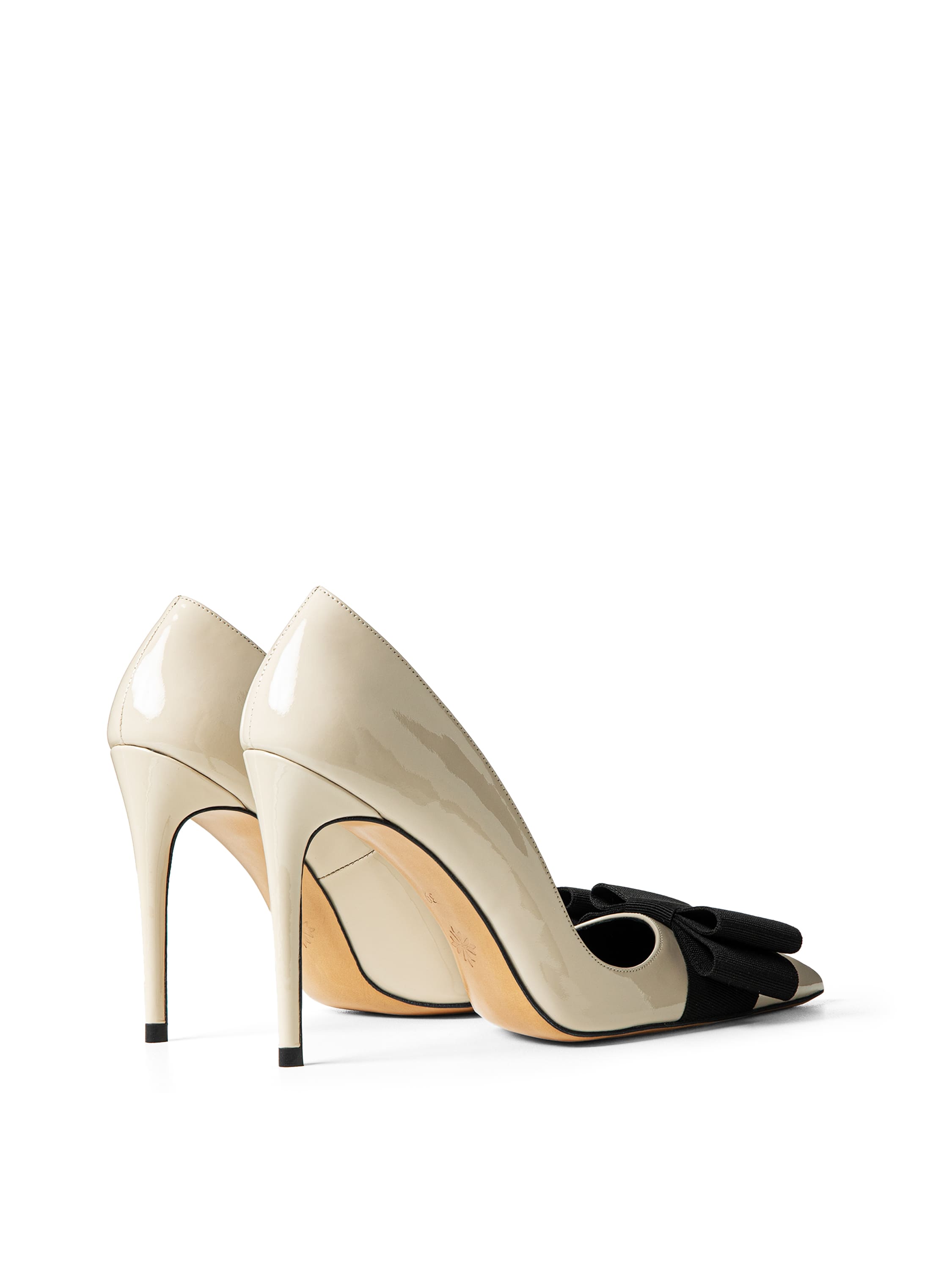 Элегантные туфли-лодочки светло-бежевого цвета выполнены из лаковой кожи. Модель с удлиненным мысом украсили черным бантом.